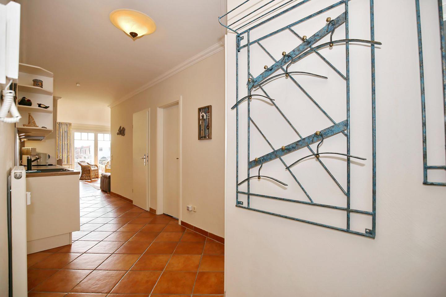 Die Wohnung Nr. 115 im Meeresblick ist eine 3-Zimmer-Ferienwohnung mit einer Größe von etwa 60 m². Sie befindet sich in der 1. Etage auf der Süd-Westseite des Hauses. Die Entfernung zum Strand beträgt etwa 50 Meter.