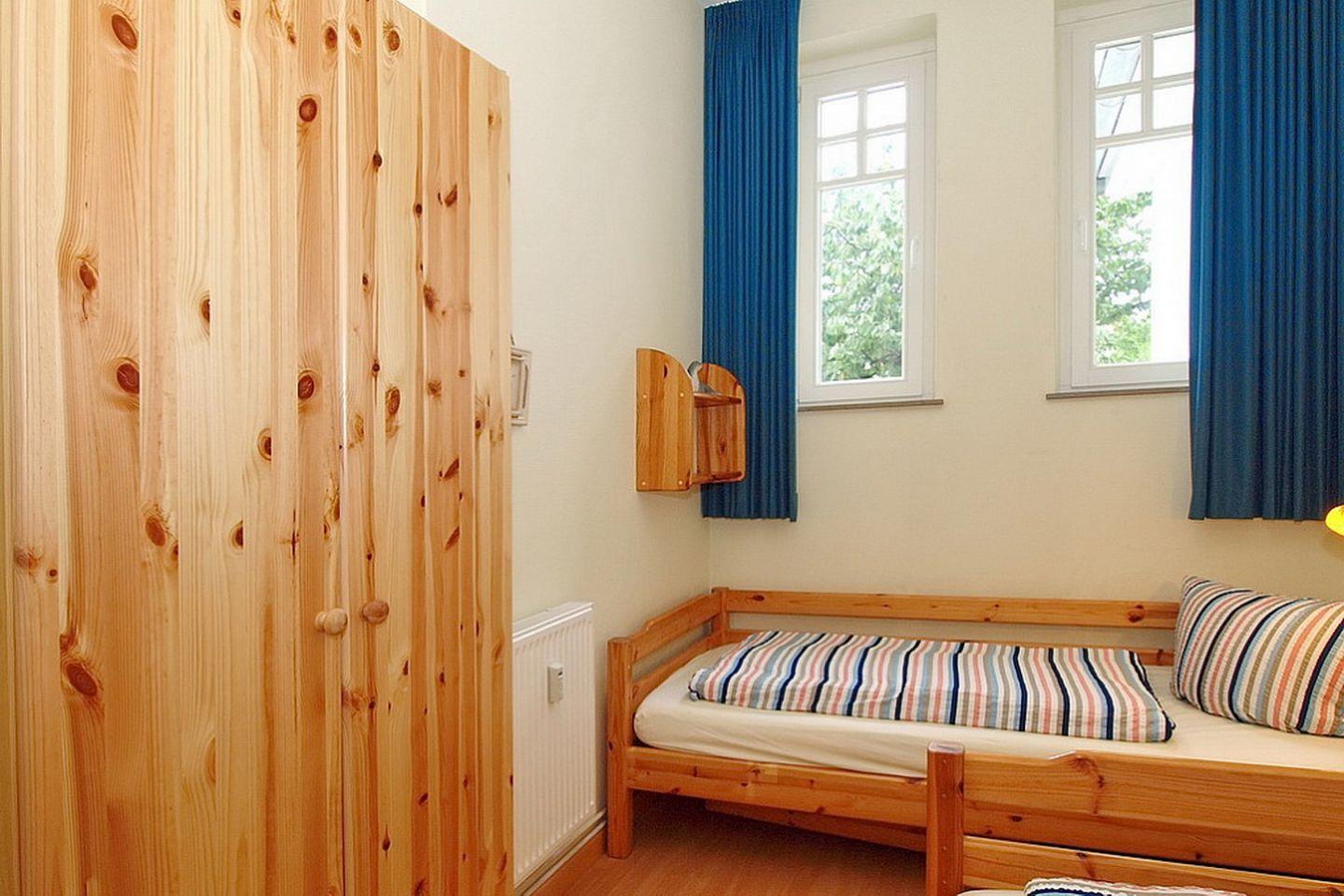 Die beiden Schlafzimmer in der Ferienwohnung versprechen geruhsame Stunden. Im ersten Schlafzimmer steht ein Doppelbett (2 x 90 x 200 cm) und im zweiten Schlafzimmer 2 Einzelbetten (90 x 200 cm). Deine Urlaubsgarderobe kannst du in den Kleiderschränken der Schlafzimmer verstauen. Zum Verdunkeln der Räume nutzt du Vorhänge.