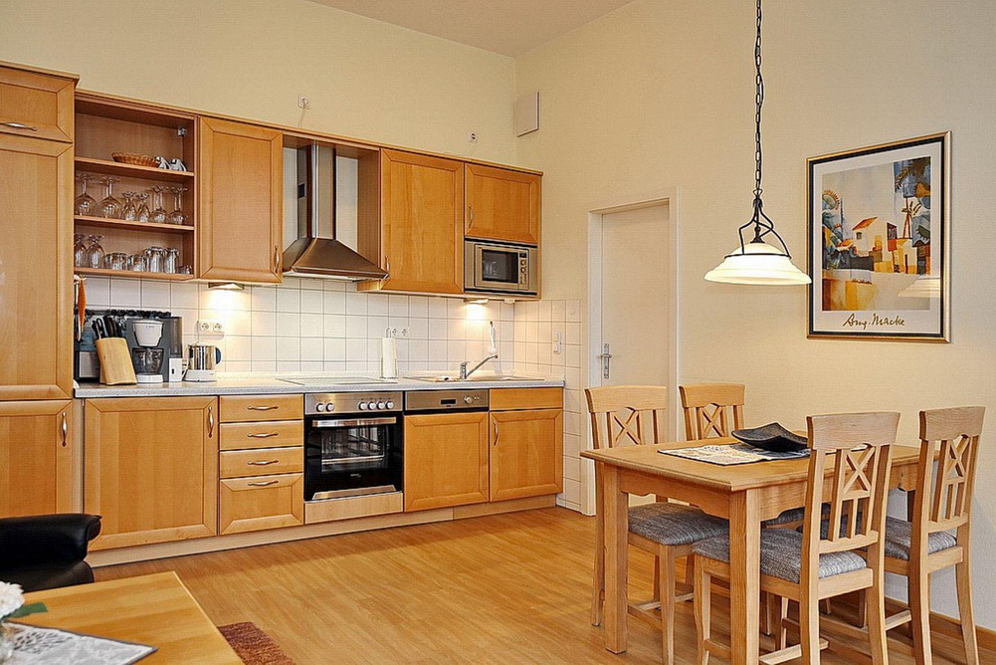 Deine Mahlzeiten bereitest du in der angrenzenden Küche zu. Die im Wohnbereich integrierte Küchenzeile bietet dir einen Backofen, ein 4-Platten-Cerankochfeld, eine Mikrowelle, einen Geschirrspüler, einen Kühlschrank mit Gefrierfach und selbstverständlich auch eine Kaffeemaschine, einen Wasserkocher und einen Toaster.