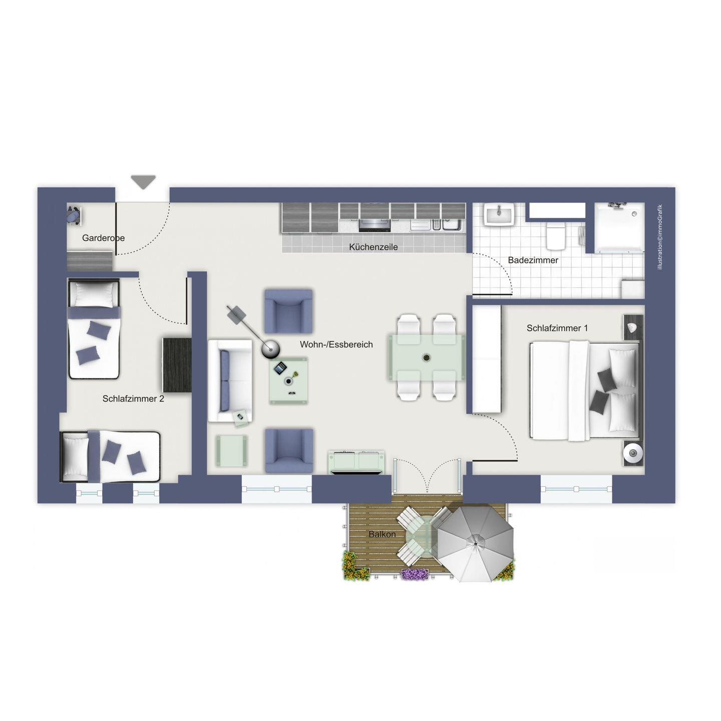 Genieße deinen Urlaub am Meer in dieser 53 m² großen Hochparterre-Wohnung. Nutze den großzügigen Wohnbereich mit Küchenzeile, die zwei Schlafzimmer und ein Duschbad. Auf dem westlich ausgerichteten Balkon kannst du am Nachmittag eine Tasse Kaffee und abends ein Glas Wein genießen. Bis zum feinen Kühlungsborner Sandstrand sind es nur etwa 50 Meter.