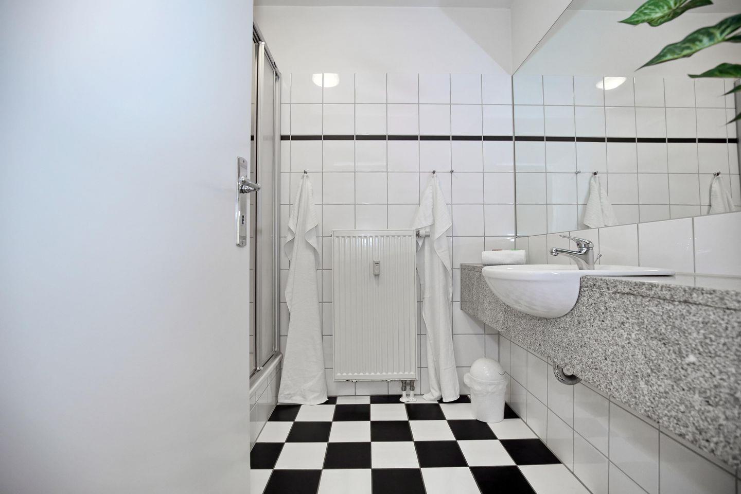 Die Ferienwohnung verfügt über ein gefliestes Duschbad mit WC. Für deine Waschutensilien findest du genügend Platz auf dem großzügigen Waschtisch. Ein Föhn komplettiert die Ausstattung des Bades.