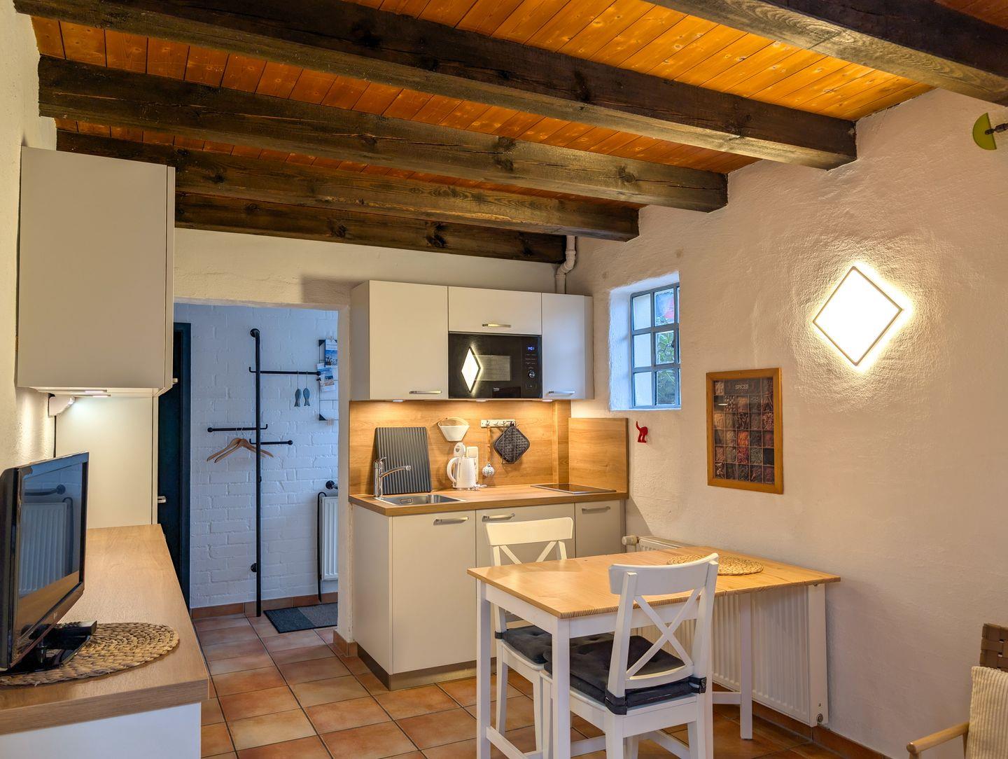Die angrenzende Pantry-Küche ist mit einem Kühlschrank mit Gefrierfach, einem 2-Platten-Kochfeld, einer Mikrowelle, einem Toaster sowie einer Kaffeemaschine ausgestattet.