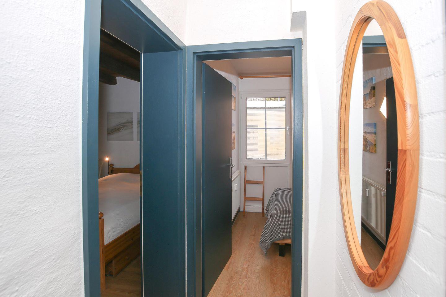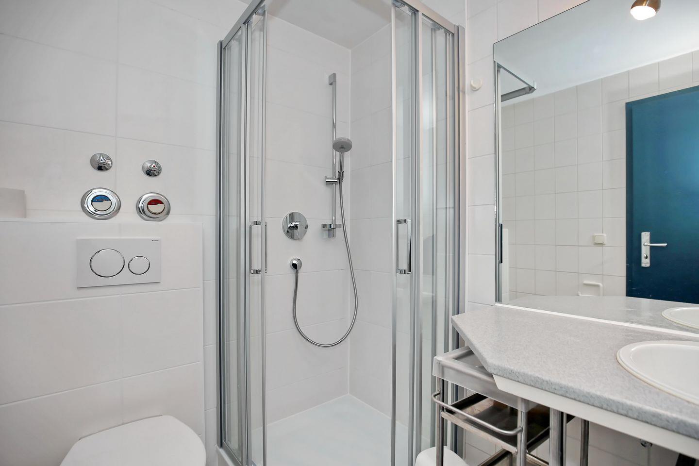 Das Bad verfügt über eine Dusche und WC sowie einen Waschtisch. Deine Waschutensilien kannst du in einem kleinen Regal abstellen. Der Wohn- und Essbereich sowie das Bad und der Flur sind gefliest. In den Schlafzimmern sind Holzdielen verlegt.