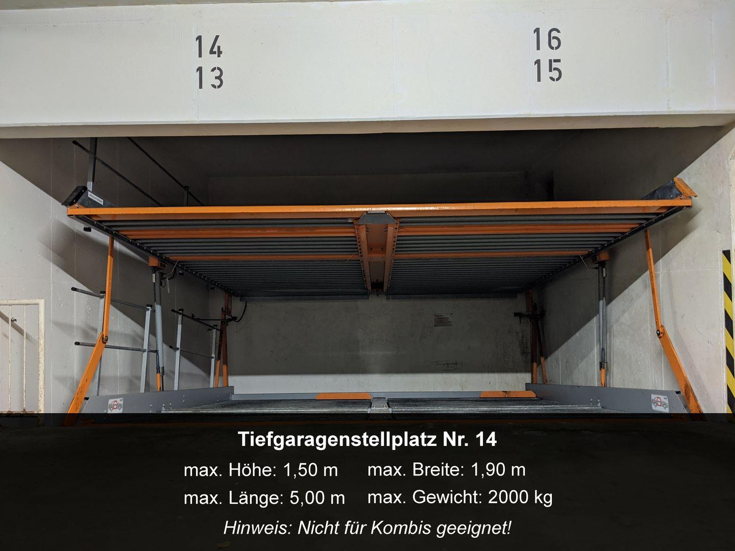 Deinen PKW kannst du in der Tiefgarage auf dem Stellplatz Nr. 14 parken (max. Parkhöhe 1,50 m; für Kombis nicht geeignet). Fahrräder können in einem Fahrradkeller in der Tiefgarage abgestellt werden.
