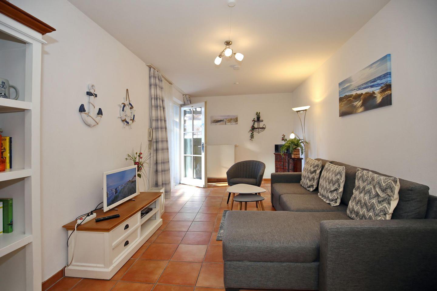 Der Wohnbereich dient auch als Eingangsbereich, denn du hast über die Terrasse den direkten Zugang zur Ferienwohnung. Hier stehen dir ein Sessel und ein bequemes Schlafsofa (150 x 200 cm) zur Verfügung. Zur Unterhaltung gibt es außerdem einen Flachbild-TV, eine Stereoanlage und eine Auswahl an Büchern.