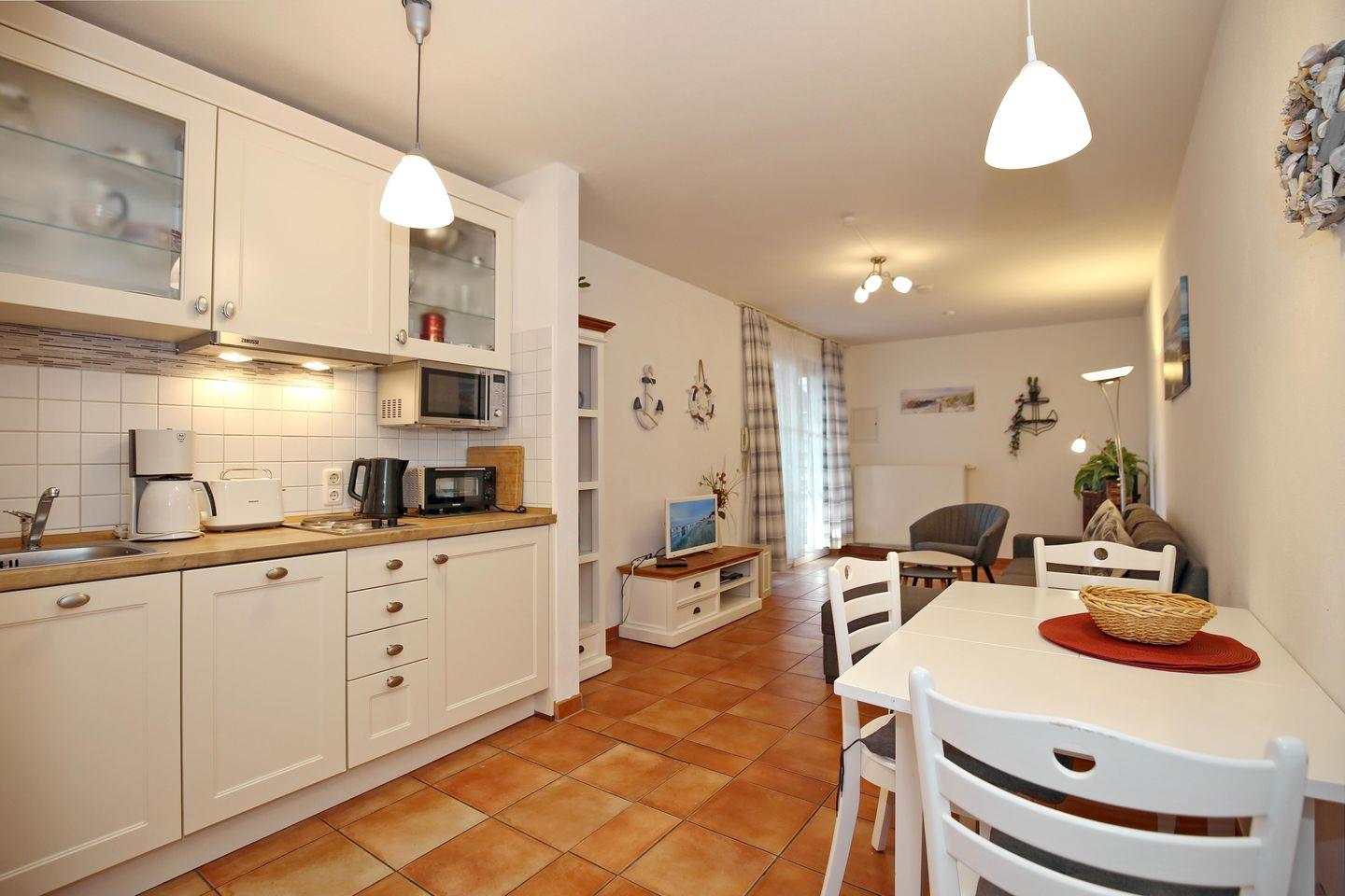 Die im Wohnraum integrierte Küchenzeile ist gut sortiert und verfügt unter anderem auch über 2 Kochfelder, einen Mini-Backofen, einen Kühlschrank mit Gefrierfach, einen Geschirrspüler, eine Mikrowelle, eine Kaffeemaschine, einen Wasserkocher und einen Toaster. Direkt gegenüber liegt der Esstisch mit drei Sitzplätzen.