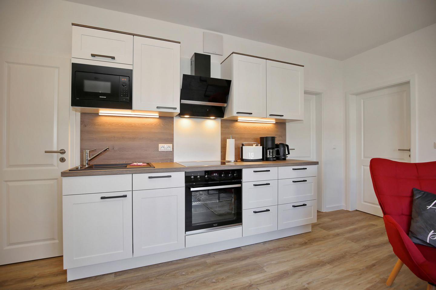 Im Wohnbereich befindet sich außerdem die gut sortierte Küchenzeile. Mit einem 4-Cerankochfeld, einem Backofen, einem Geschirrspüler, einer Mikrowelle, einem Kühlschrank mit Gefrierfach und selbstverständlich auch mit einem Toaster, einem Wasserkocher und einer Kaffeemaschine bleiben keine Wünsche offen.