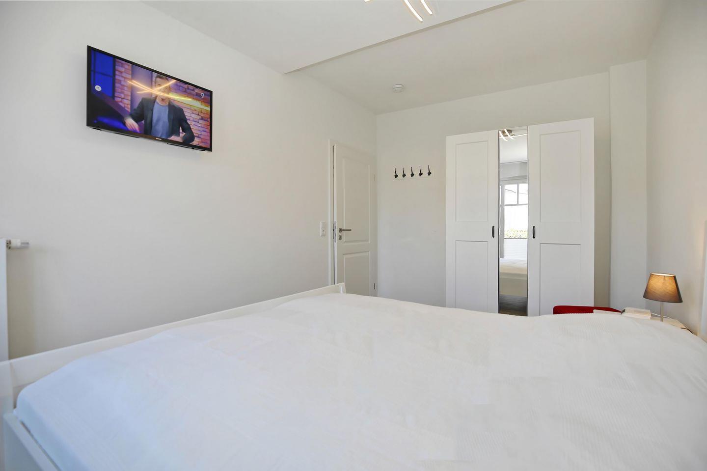 Als Rückzugsmöglichkeit in der Ferienwohnung dient das große Schlafzimmer mit Doppelbett (2 x 90 x 200 cm). Deine Urlaubs-Garderobe kannst du im Kleiderschrank und den beiden Nachttischen unterbringen. Zur Verdunklung wurden an den Fenstern der gesamten Wohnung Plissees und Vorhänge angebracht.