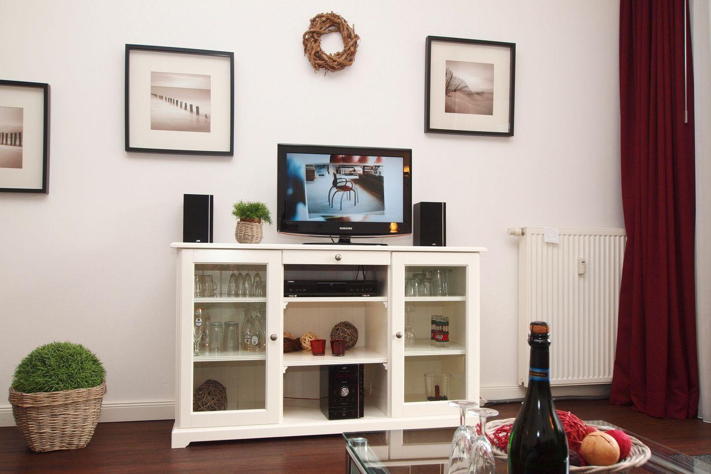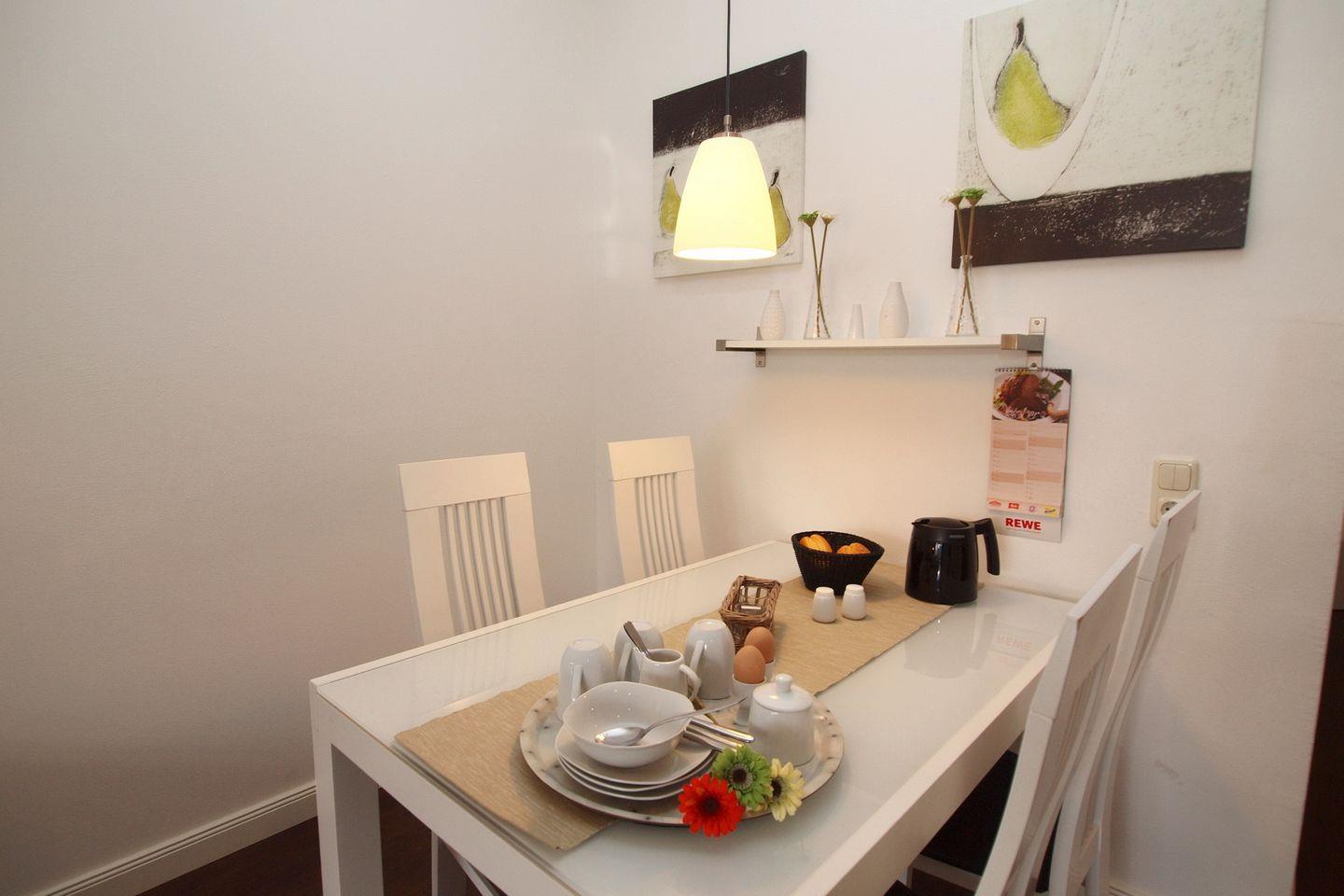 Eine Ledercouchgarnitur im Wohnzimmer der Ferienwohnung lädt dich zu geruhsamen Stunden ein. Ein Flatscreen-TV, ein Internetradio sowie ein DVD-Player bieten dir mediale Unterhaltung. Den WLAN-Anschluss (ohne Gewähr) kannst du kostenlos nutzen. Der freundlich helle Essbereich erwartet dich mit einem Tisch und 4 Stühlen zu deinen gemeinsamen Mahlzeiten.