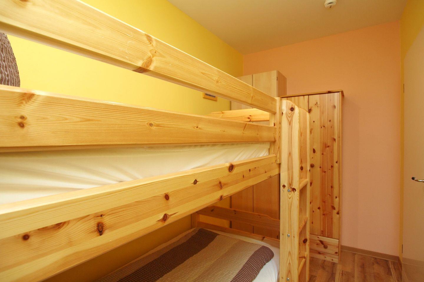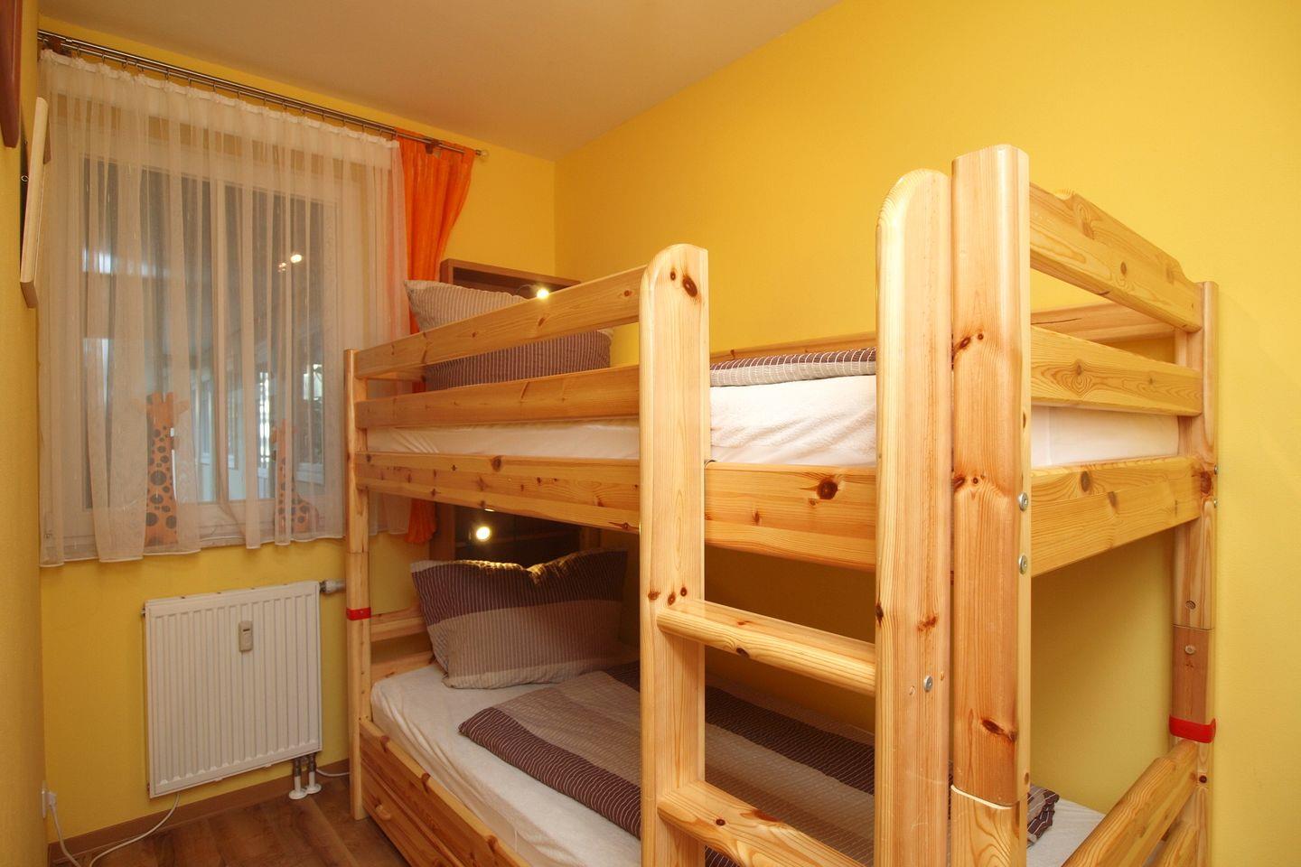 Das erste Schlafzimmer ist mit einem Doppelbett (2 x 90 x 200 cm) und Kleiderschrank ausgestattet. Das zweite Schlafzimmer ist mit einem Etagenbett (je 90 x 200 cm) und ebenfalls mit einem Kleiderschrank versehen. Rollos und Vorhänge dienen zum Verdunkeln (die Schlafzimmerfenster gehen zum Atrium raus).
