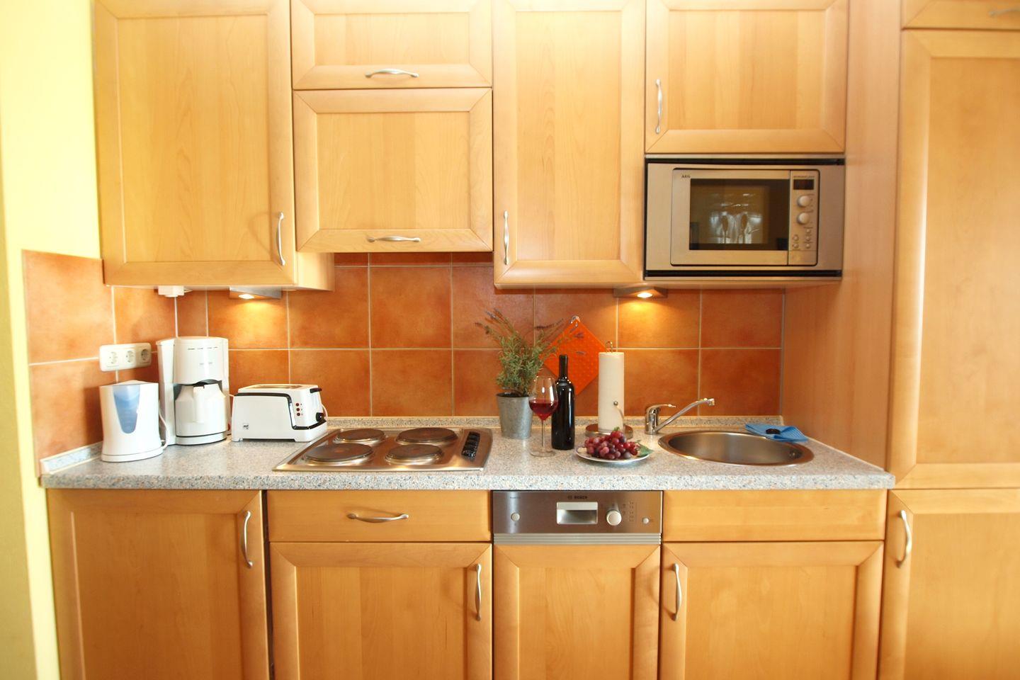 Die Küchenzeile hat aber auch einiges zu bieten: vier Kochfelder, eine Mikrowelle mit Grillfunktion, einen Kühlschrank mit Gefrierfach, eine Kaffeemaschine, einen Toaster, einen Wasserkocher und einen Geschirrspüler – alles da, was man so braucht und den Urlaub nur noch angenehmer macht.