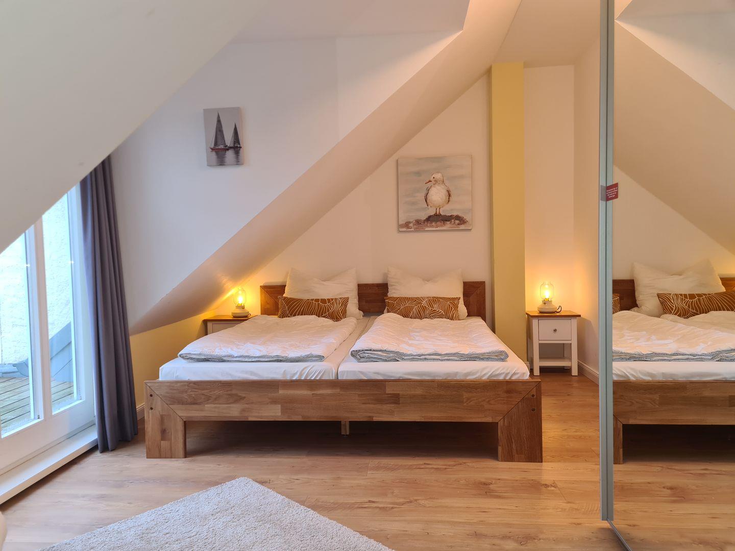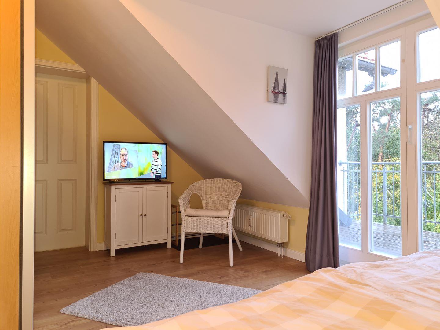 Erholung findest du auch im Schlafzimmer in dem komfortablen Doppelbett (180 cm x 200 cm). Der große Kleiderschrank bietet ausreichend Stauraum für deine Urlaubsgarderobe. Zur Verdunklung wurden an den Fenstern Vorhänge angebracht. Eine Besonderheit dieser Ferienwohnung ist, dass du von hier aus auch den Balkon betreten kannst. Außerdem steht dir im Schlafzimmer ein 2. TV zur Verfügung.
