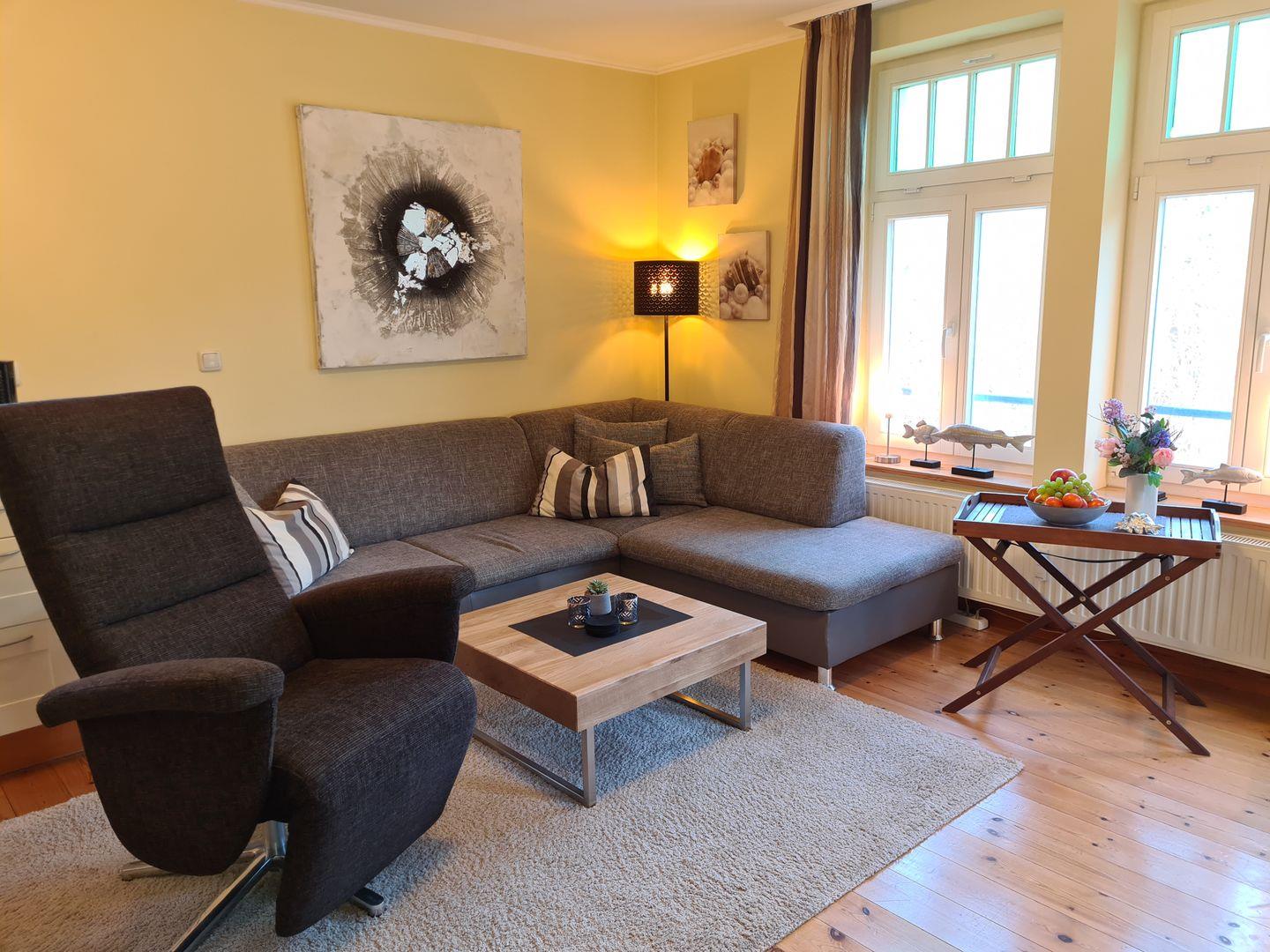 In gemütlicher Atmosphäre kannst du hier im 2. Obergeschoss auf etwa 40 Quadratmetern entspannen. Es erwarten dich ein einladender Wohnbereich mit Küchenzeile und Essecke sowie ein separates Schlafzimmer und ein Badezimmer. Auf dem großzügigen Balkon Richtung Norden kannst du den Blick zum Stadtwald genießen. Zum feinen Ostseestrand sind es ca. 800 Meter.