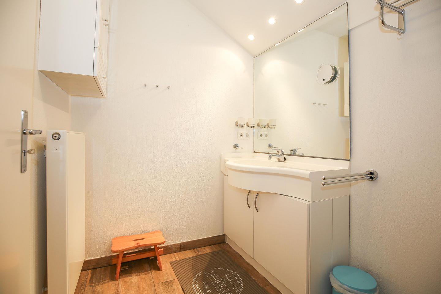 Das innenliegende Duschbad ist ausgestattet mit einem WC, einem Waschbecken und einem großen Spiegel. In der Ferienwohnung wurden Fliesen verlegt. Nur im Schlafzimmer ist ein Teppichboden zu finden.