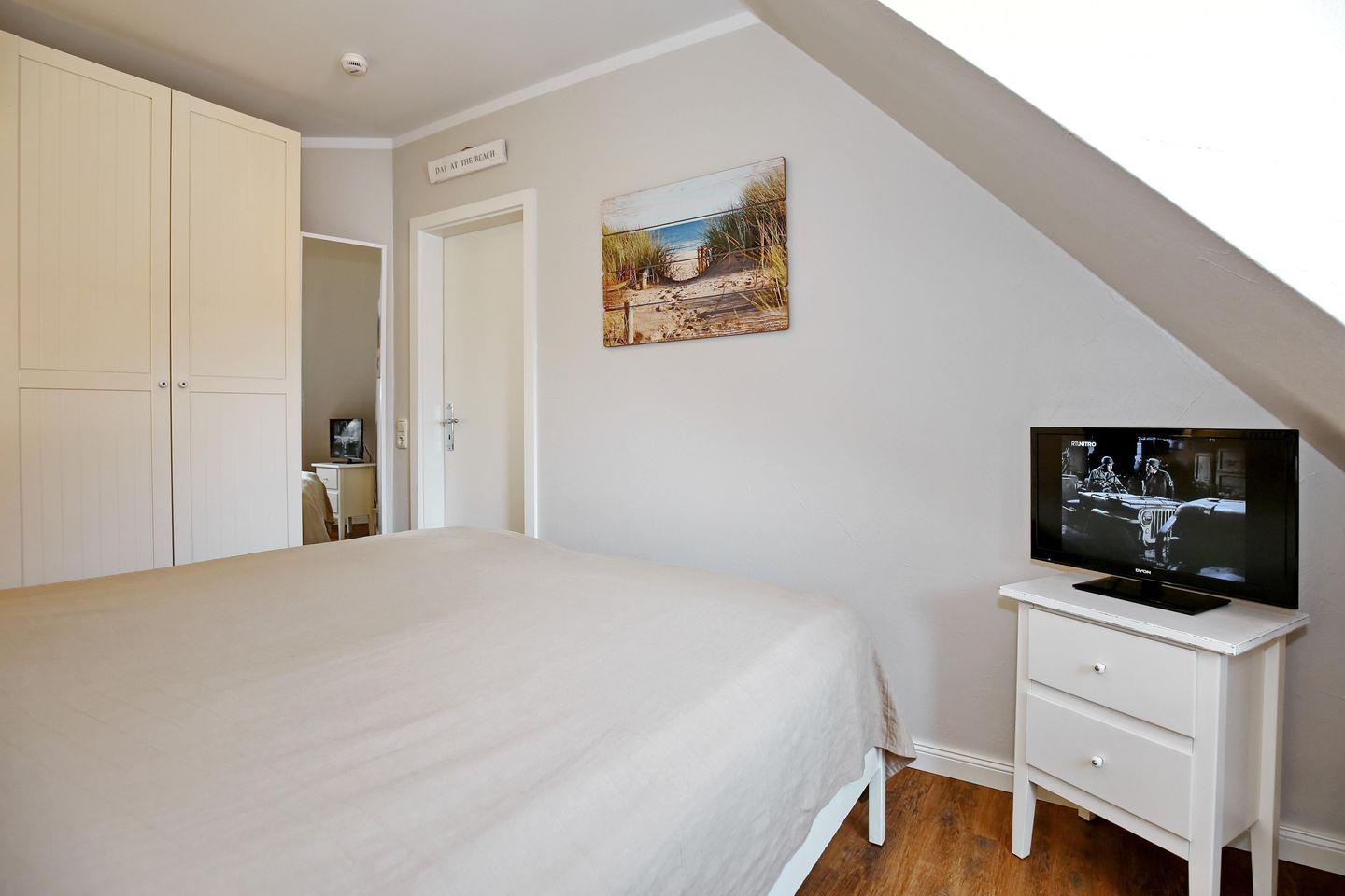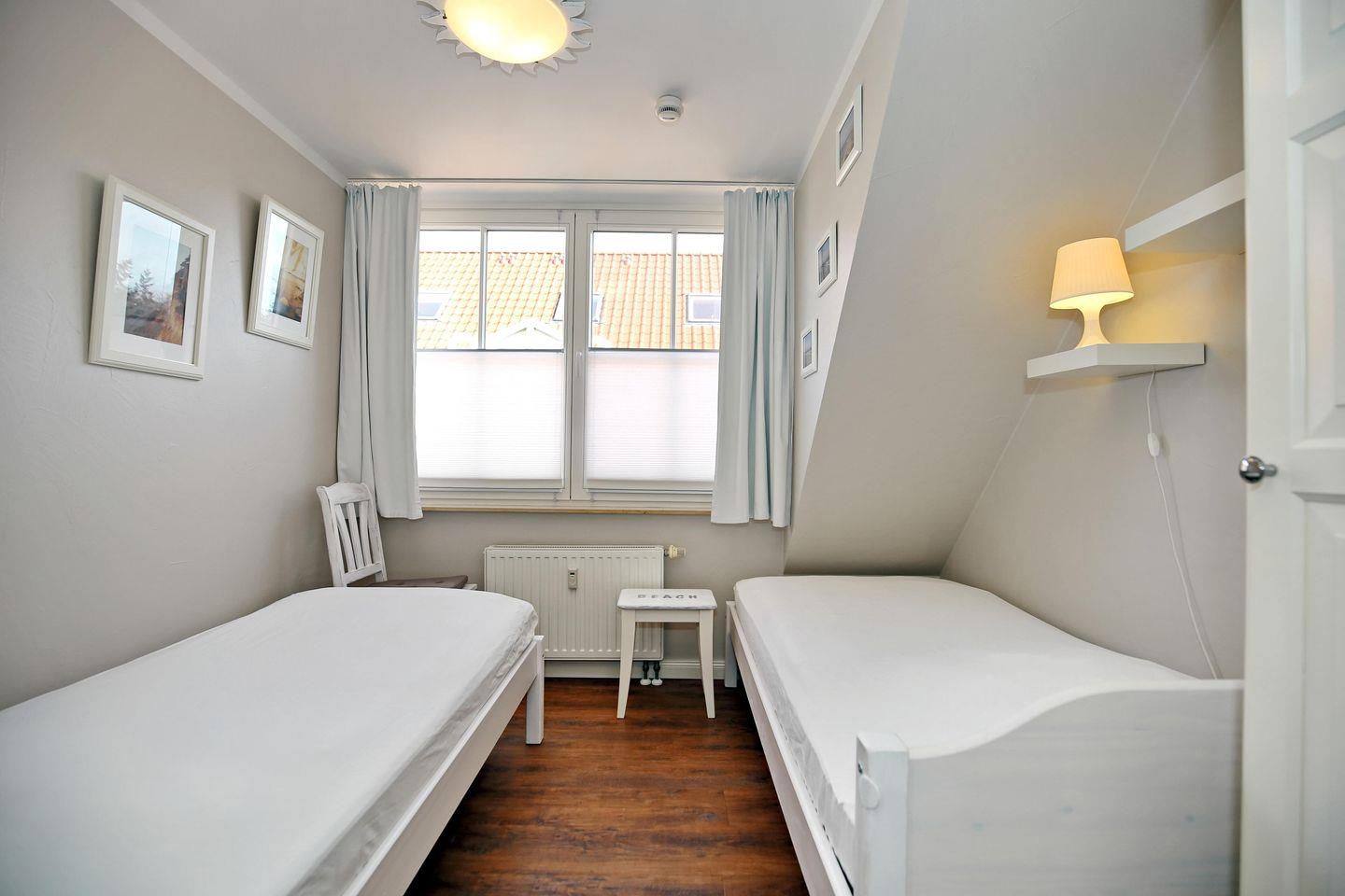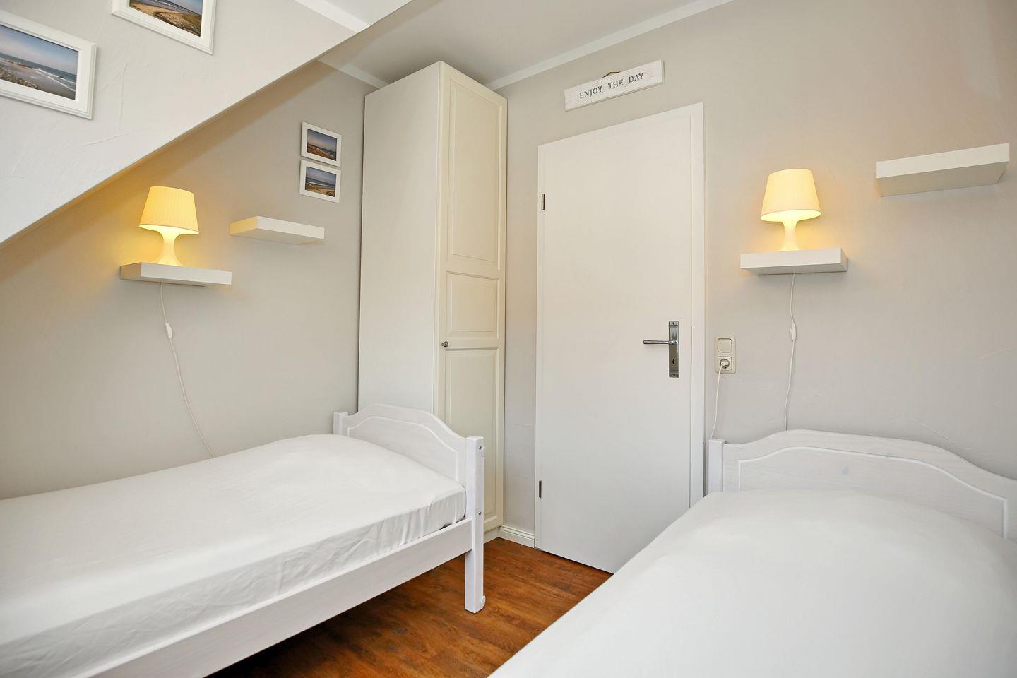 Im ersten Schlafzimmer empfängt dich ein komfortables Doppelbett (2 x 90 x 200 cm) zum erholsamen Schlaf. Ein zweiter TV sorgt hier für abendliche Unterhaltung. Der vorhandene Kleiderschrank bietet dir ausreichend Stauraum für deine Urlaubsgarderobe. Im zweiten Schlafzimmer laden dich 2 Einzelbetten (je 90 x 200 cm) zur Nachtruhe ein. Auch bietet ein Kleiderschrank genügend Platz für dein Gepäck. Vorhänge und Plissees dienen dir in beiden Schlafräumen als Sichtschutz.