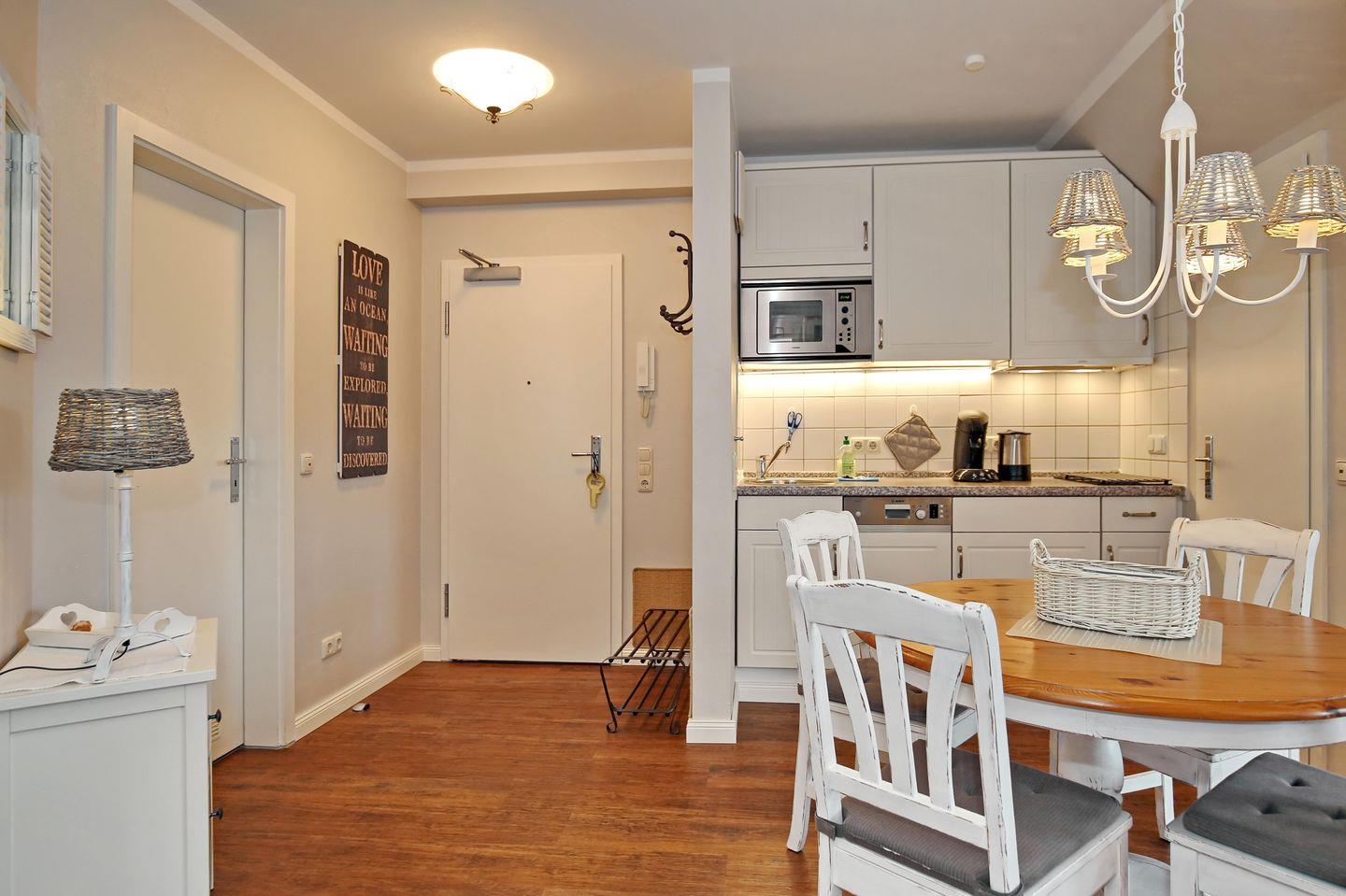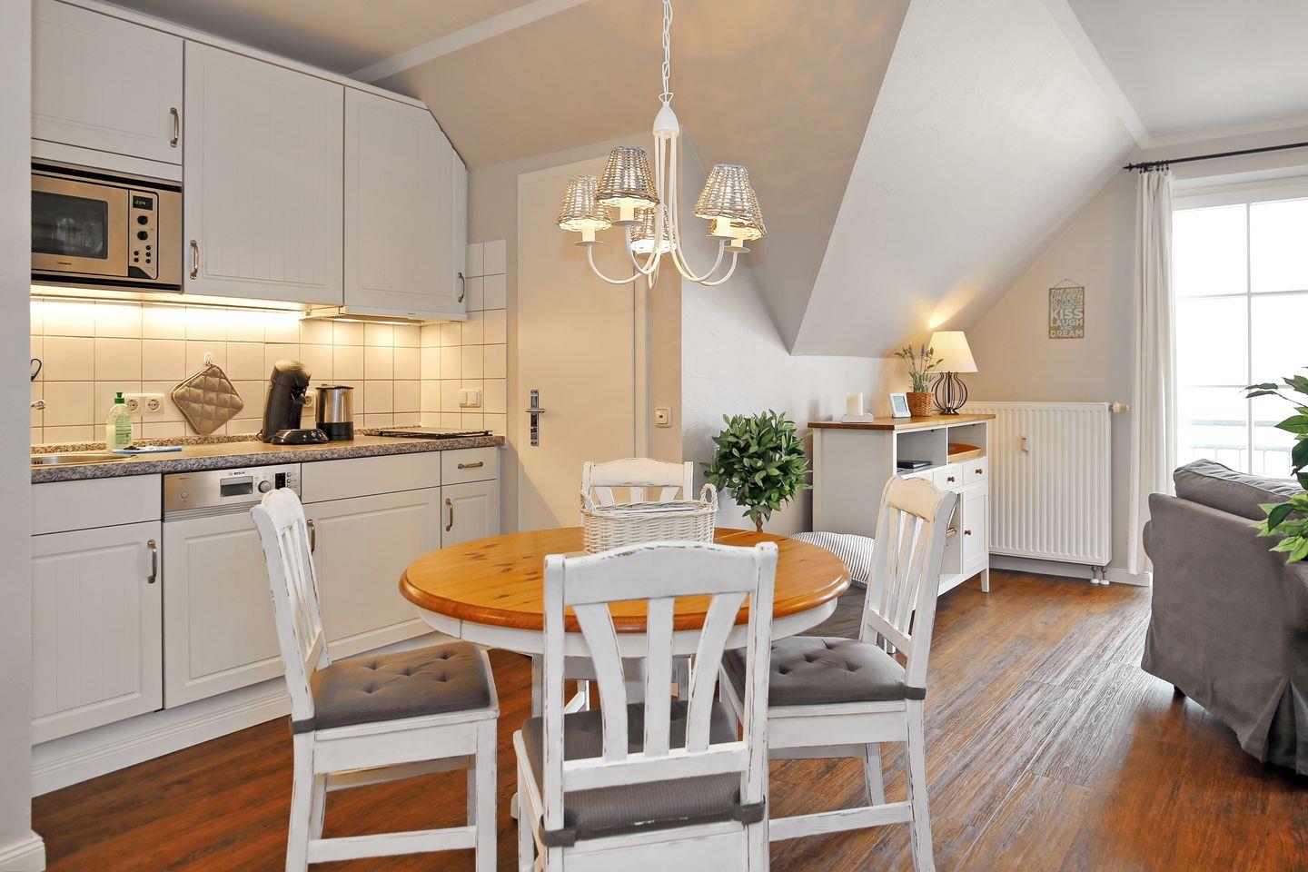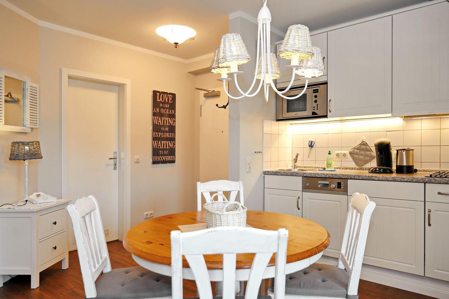 Die im Wohnbereich integrierte Küchenzeile ist mit einem Kühlschrank, 2 Ceranfeldern, einem Geschirrspüler sowie einer Mikrowelle ausgestattet. Natürlich stehen dir auch eine Kaffeemaschine, eine Senseo-Kaffeepadmaschine, ein Toaster und ein Wasserkocher zur Verfügung. Der Essbereich bietet dir ausreichend Platz für gemeinsame Mahlzeiten.