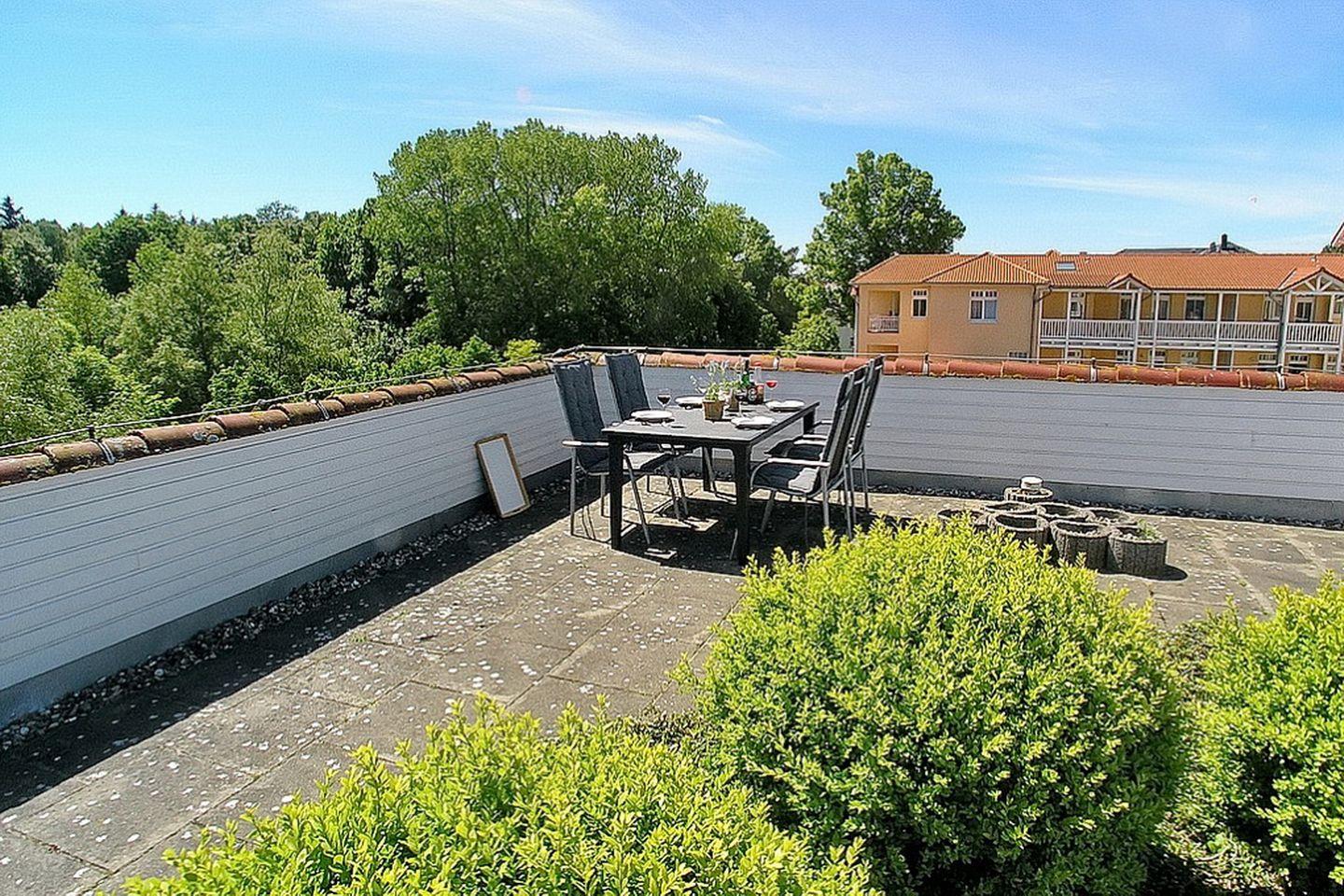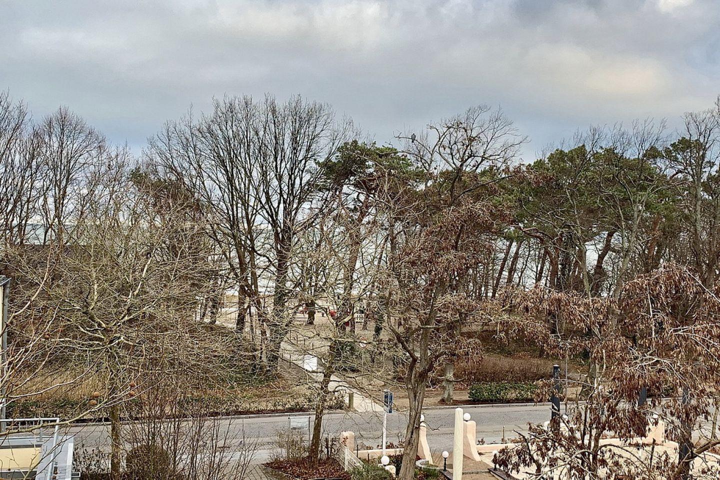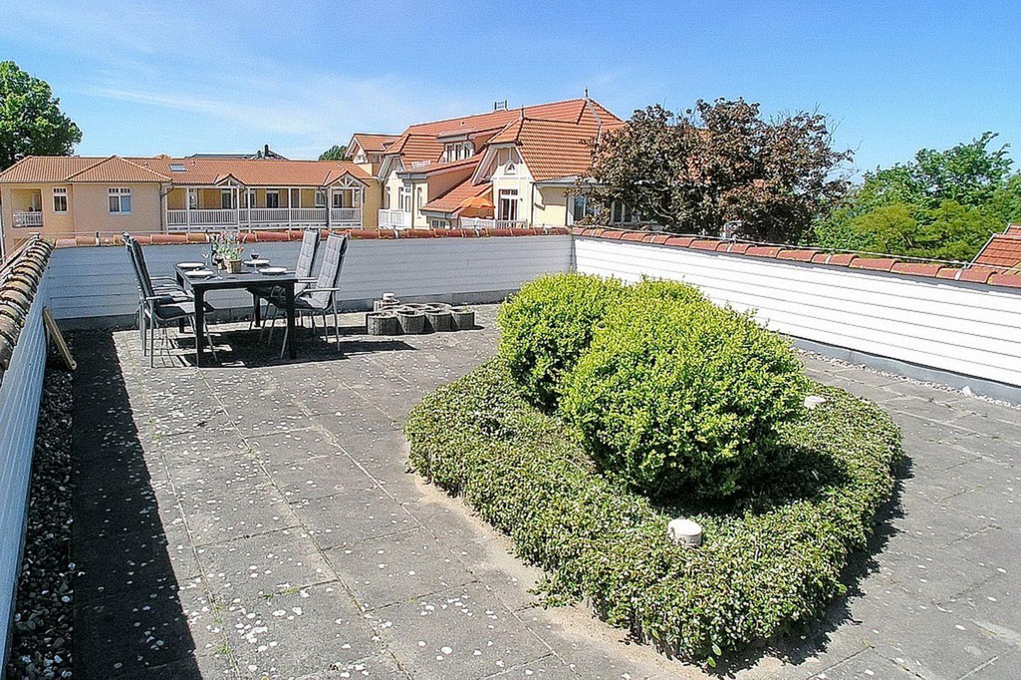 Moderne 3-Zimmer-Ferienwohnung mit großer Dachterrasse und Meerblick in Kühlungsborn, nur 50 m vom Strand entfernt.
