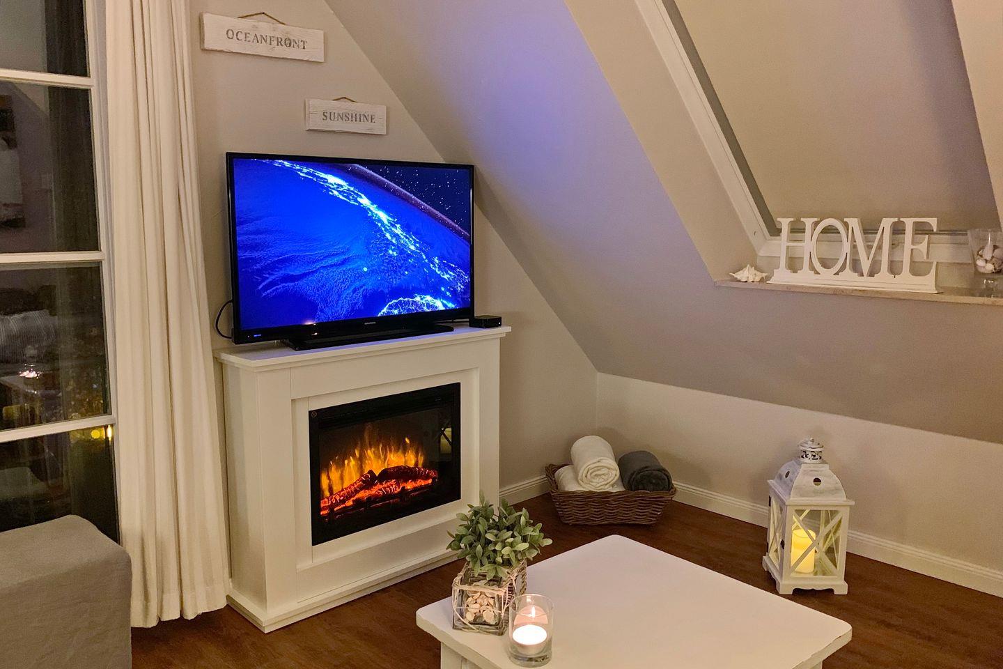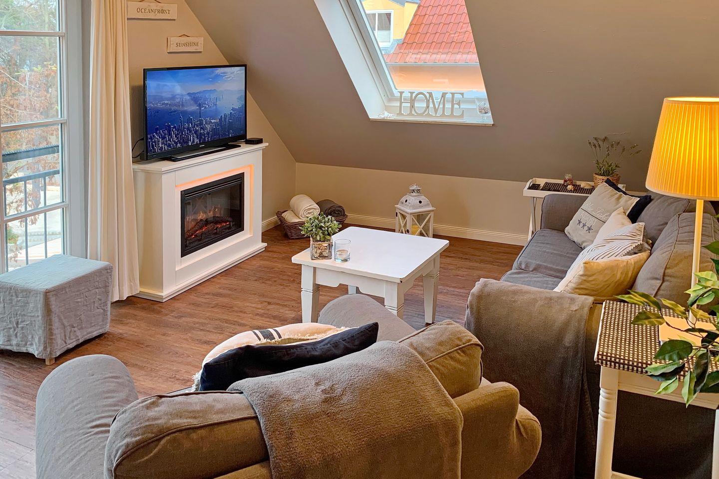 Der Wohnbereich der Ferienwohnung ist mit einem Sofa, einem Elektrokamin, einem Sessel und 2 Hockern gemütlich eingerichtet. Für deine Unterhaltung stehen ein Flachbild-TV und eine Stereoanlage mit Anschlüssen für einen iPod und MP3-Player bereit. Außerdem verfügt die Wohnung über einen kostenlosen WLAN-Anschluss.