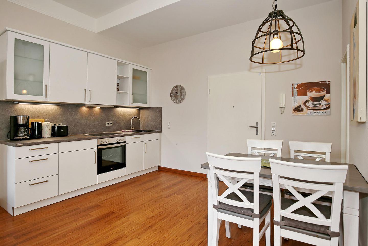 Im Wohnbereich steht ein bequemes Doppelschlafsofa (160 x 200 cm). Für Abwechslung sorgen der Flachbild-TV, Radio und das kostenlose WLAN. Den im Hochparterre gelegenen Balkon erreichst du vom Wohnraum und vom Schlafzimmer aus. Im Wohnzimmer integriert ist auch der Esstisch für 4 Personen.