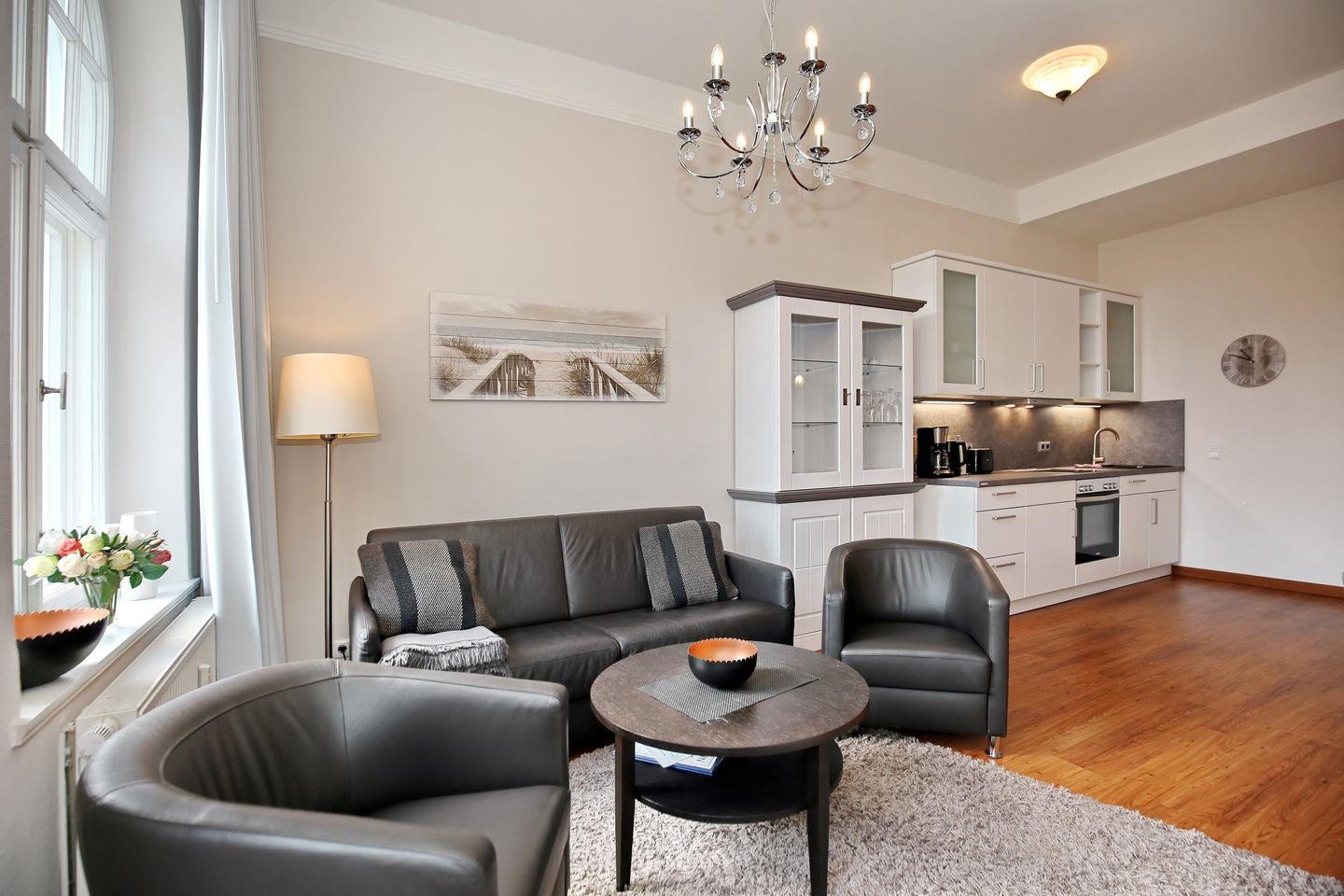 Hier wohnst du auf 42 Quadratmetern im Erdgeschoss des Hauses in Kühlungsborn West. Es erwarten dich ein einladender Wohnbereich mit Küchenzeile, ein separates Schlafzimmer und ein Badezimmer. Auf dem nach Osten ausgerichteten Balkon kannst du die ersten Sonnenstrahlen während des Frühstücks genießen. Auch der 50 Meter entfernte weiße Strand lädt zu einem Besuch ein.