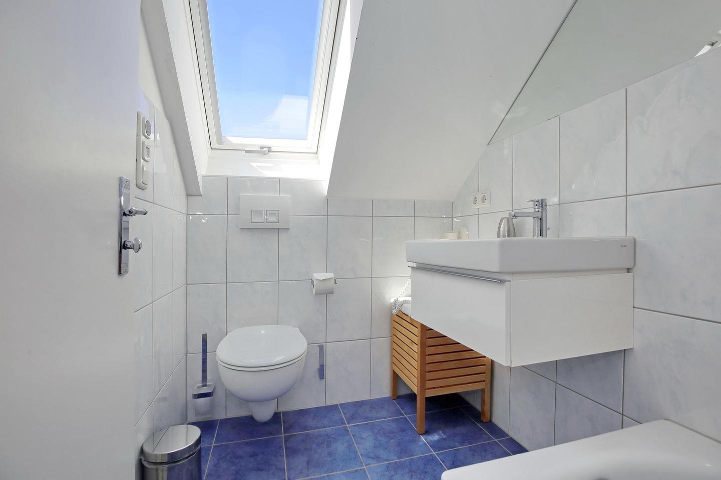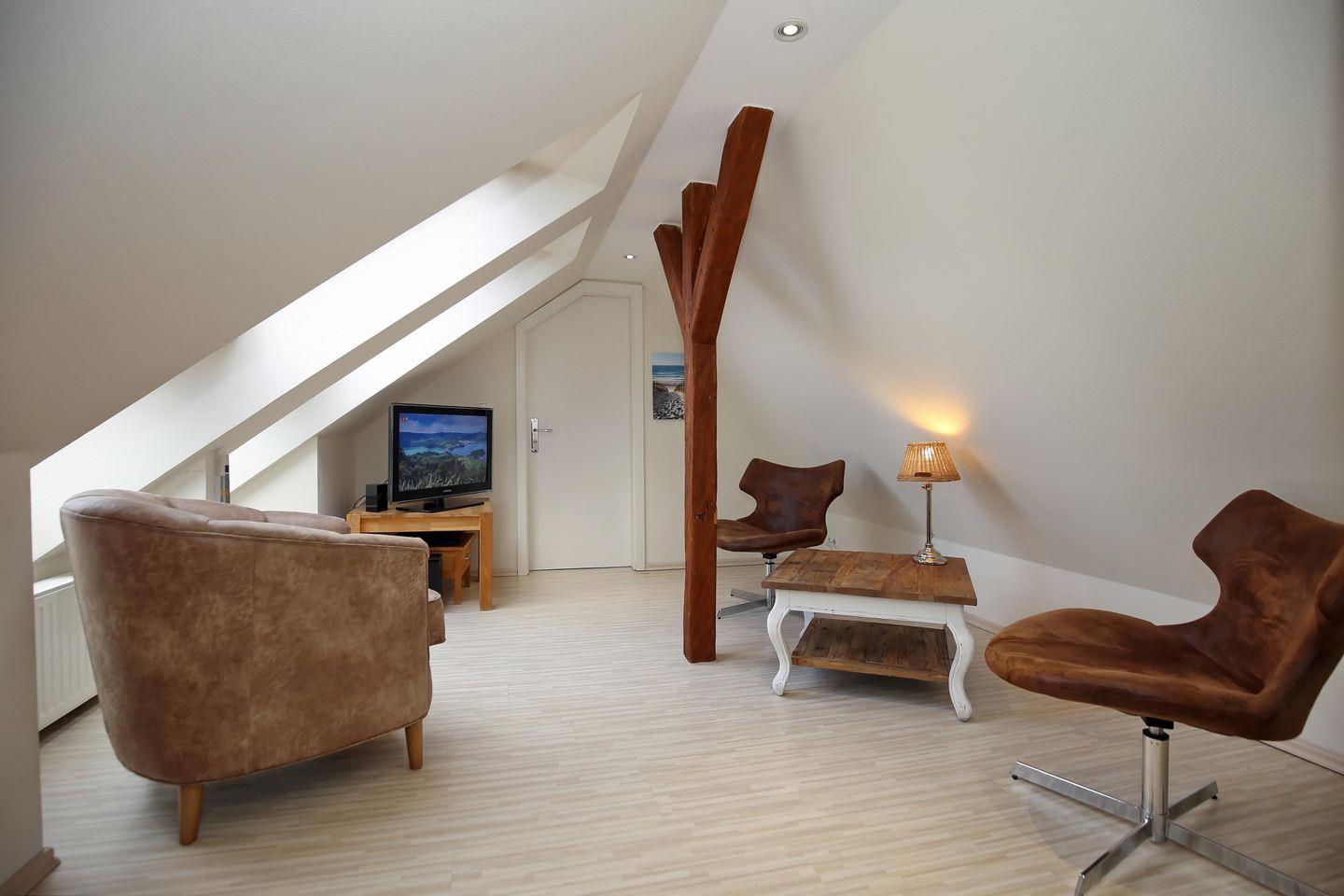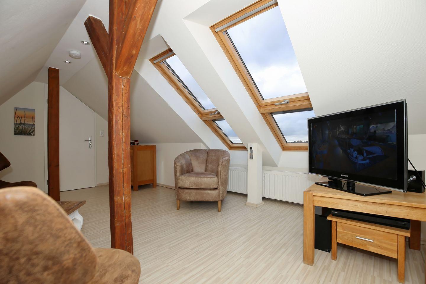 Über die Treppe gelangst du ins ausgebaute Dachgeschoss. Hier steht dir ein zweiter Rückzugsort mit Lesesesseln und einem zweiten Flachbild-TV zur Verfügung. Vom Dachfenster hast du einen weiten Blick über die Dächer von Kühlungsborn West und einen Teilseeblick auf die Ostsee. Im Dachgeschoss befindet sich ein zweites Duschbad/ WC mit einer großzügigen Badewanne.