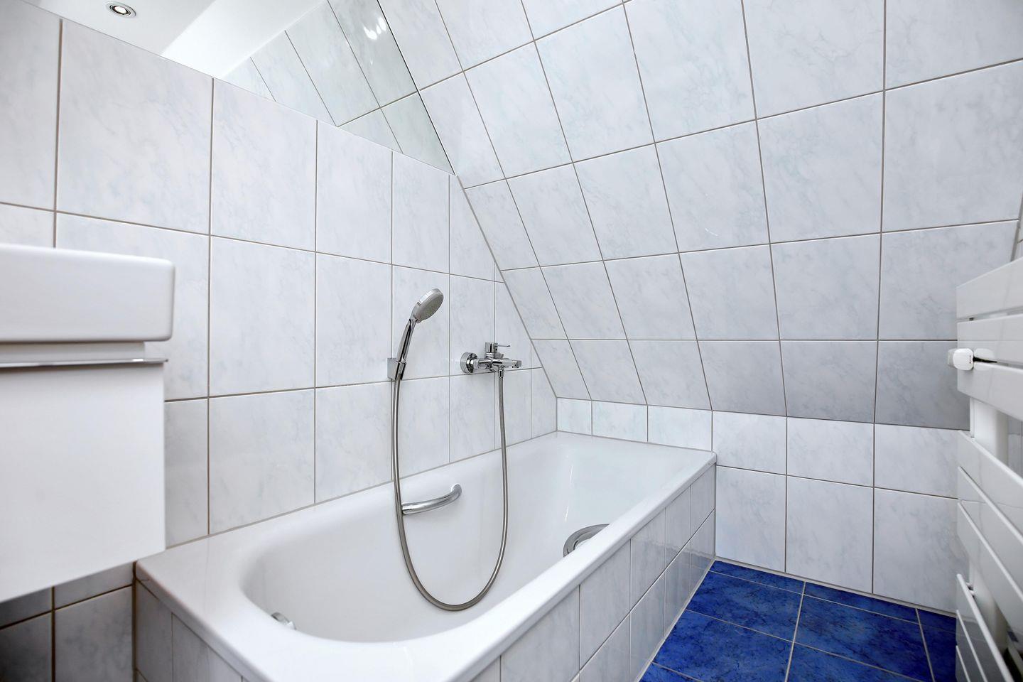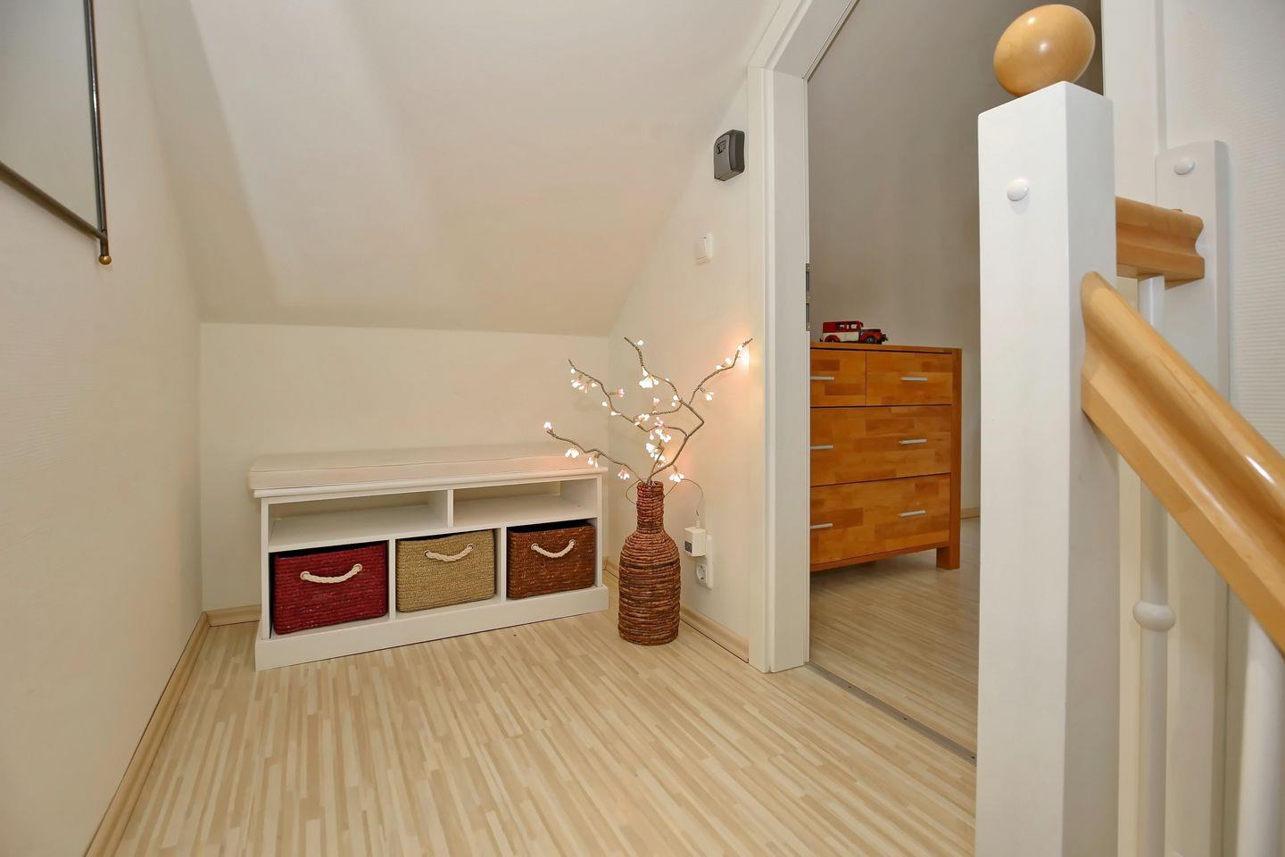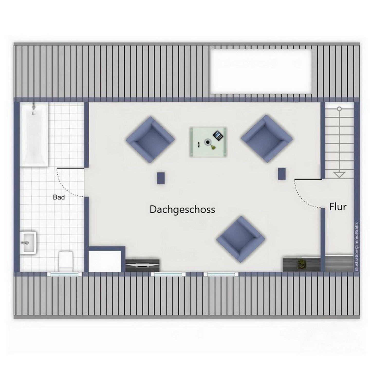 Über die Treppe gelangst du ins ausgebaute Dachgeschoss. Hier steht dir ein zweiter Rückzugsort mit Lesesesseln und einem zweiten Flachbild-TV zur Verfügung. Vom Dachfenster hast du einen weiten Blick über die Dächer von Kühlungsborn West und einen Teilseeblick auf die Ostsee. Im Dachgeschoss befindet sich ein zweites Duschbad/ WC mit einer großzügigen Badewanne.
