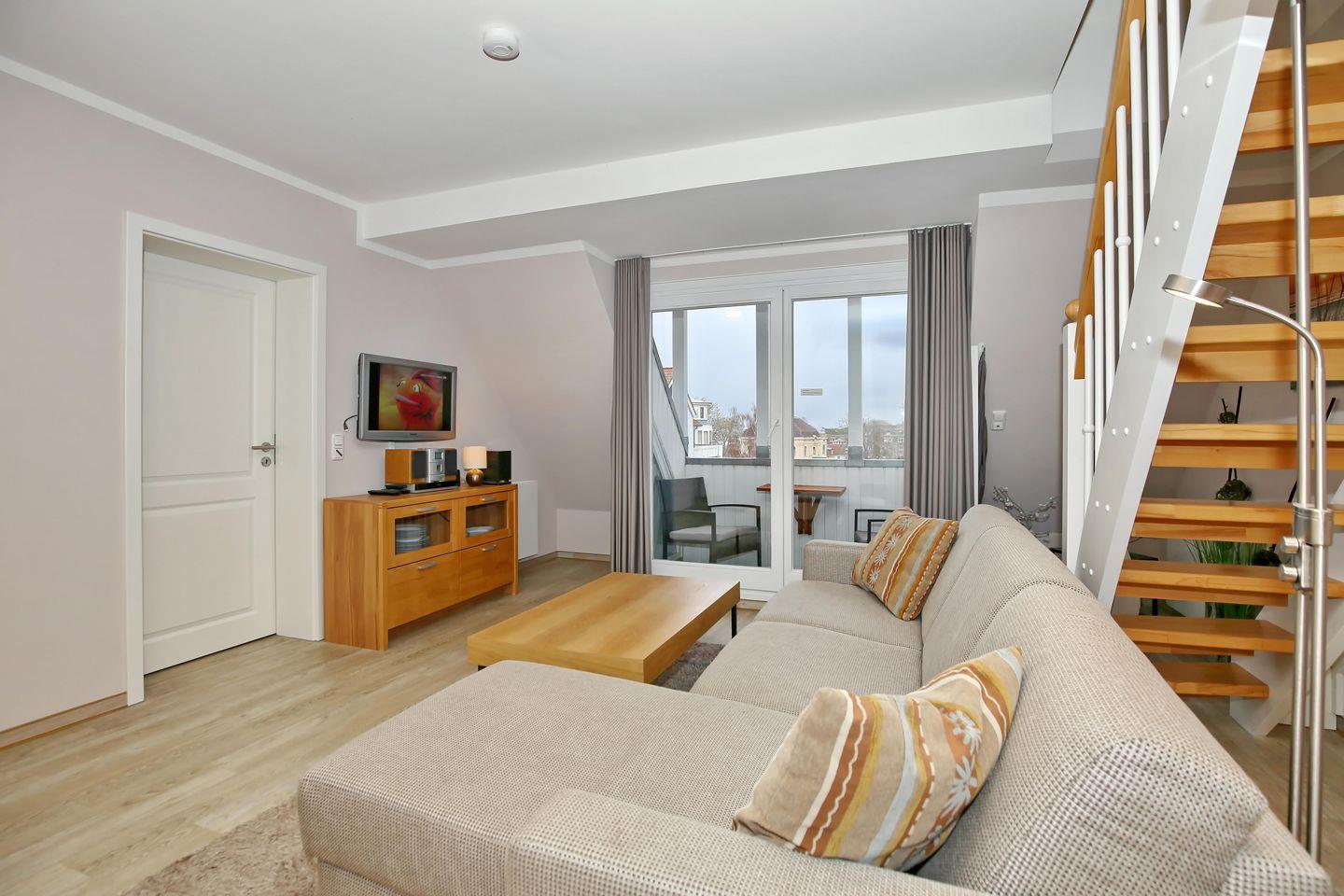 Im Wohnbereich steht dir ein Flachbild-TV mit DVD-Player und ein großzügiges Ecksofa mit Schlaffunktion (120 cm x 200 cm) zur Verfügung. Von hier aus gelangst du auf den Balkon zur Ostseite.
