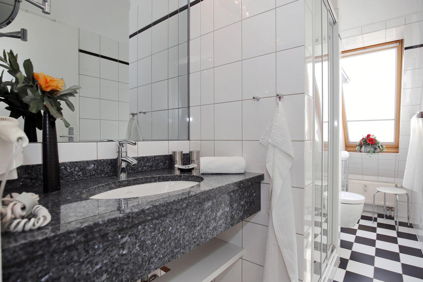 Die Ferienwohnung verfügt über ein gefliestes Duschbad mit WC, einen Föhn und einen Kosmetikspiegel.