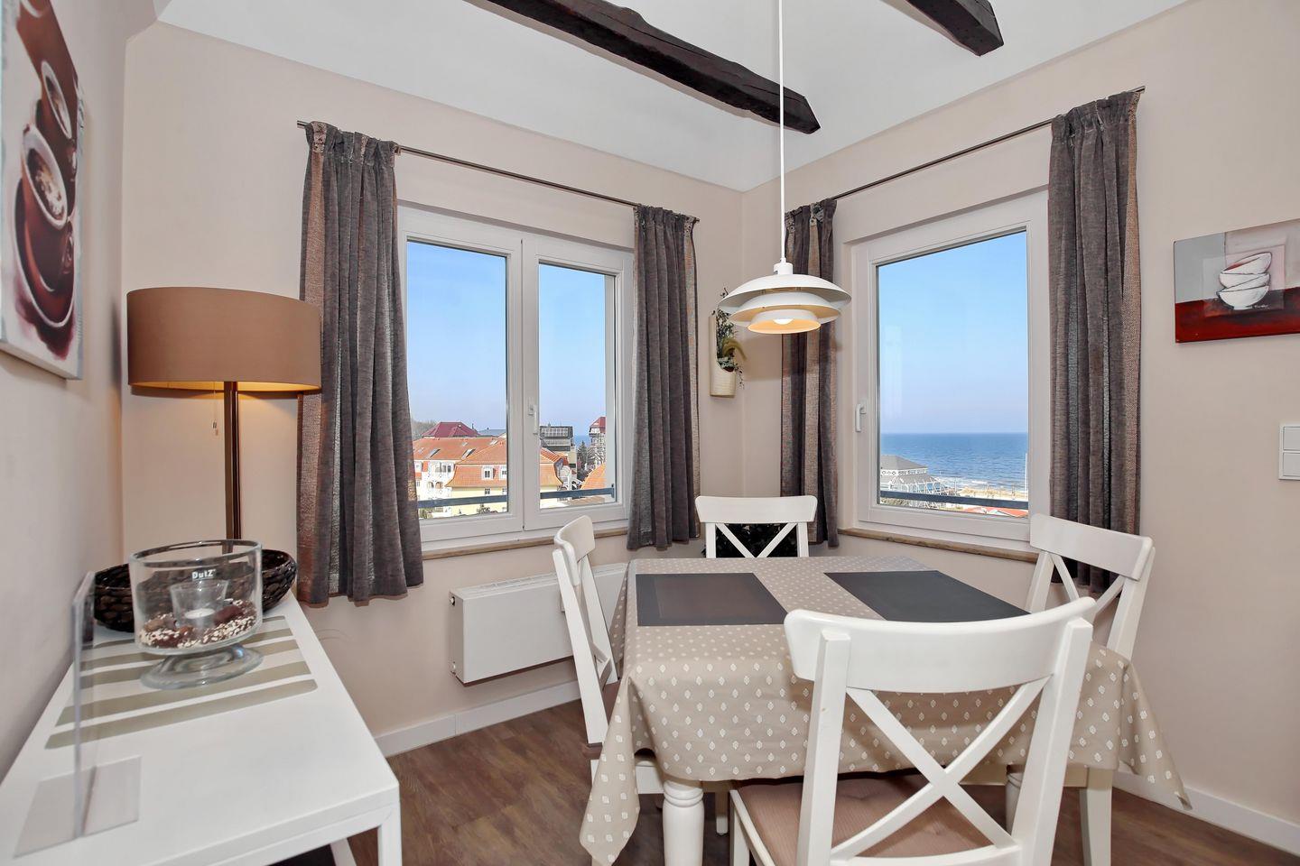 Im Wohnzimmer erwartet dich ein Flachbild-TV, ein DVD-Player, eine Stereoanlage sowie eine gemütliche Couch. Seit November 2023 verfügt die Wohnung über einen vom Wohnzimmer aus begehbarem Balkon. Von hier aus hast du einen herrlichen Meerblick und ab mittags bis abends Sonne. Die ehemalige Loggia wurde umgebaut und so in die Wohnung integriert, dass ein wunderschöner und aufgrund der drei Fenster sehr heller Essplatz mit traumhaftem Blick auf die Ostsee entstanden ist. So kann man ihn das ganze Jahr genießen.