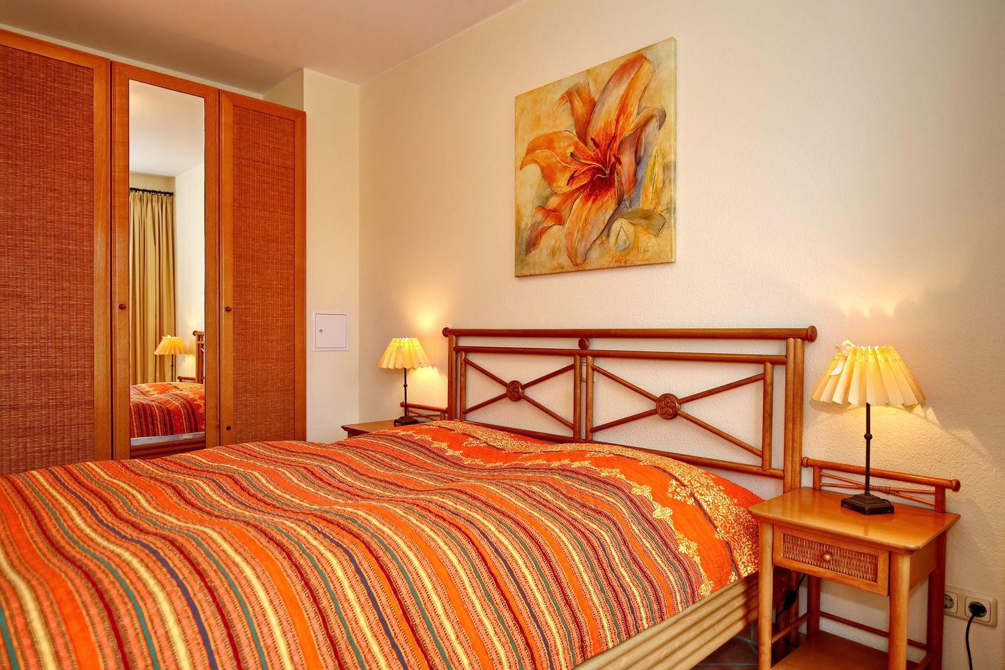 Im Schlafzimmer der Ferienwohnung findest du im komfortablen Doppelbett (2 x 80 x 200 cm) erholsamen Schlaf. Ein großer Kleiderschrank mit Spiegeltür bietet dir reichlich Stauraum. Vom Schlafzimmer aus hast du Zugang zum zweiten Balkon dieser Wohnung. Die Couch im Wohnbereich ist ausziehbar und wird so zu einem Schlafplatz (150 x 200 cm) für 1 Person. Die vorhandenen Vorhänge kannst du als Sichtschutz bzw. zum Verdunkeln nutzen.