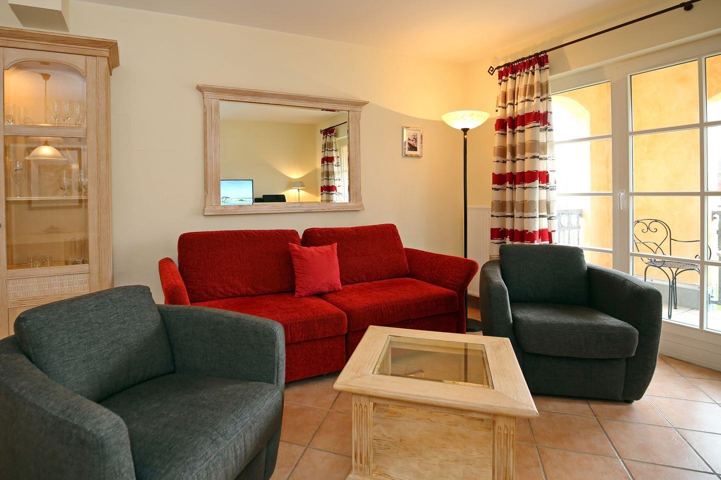 Im offenen Wohnbereich laden dich eine Couch mit zwei Sesseln, ein Flachbild-TV, ein DVD-Player und eine Stereoanlage zu geselligen Abenden ein. Von hier aus gelangst du auf den südlich ausgerichteten Balkon und kannst die Sonnenstunden des Tages genießen. Der integrierte Essbereich ist für 2 Personen großzügig eingerichtet. Außerdem steht dir kostenfreies WLAN zur Verfügung.