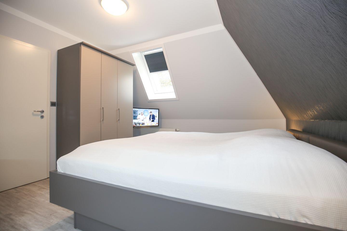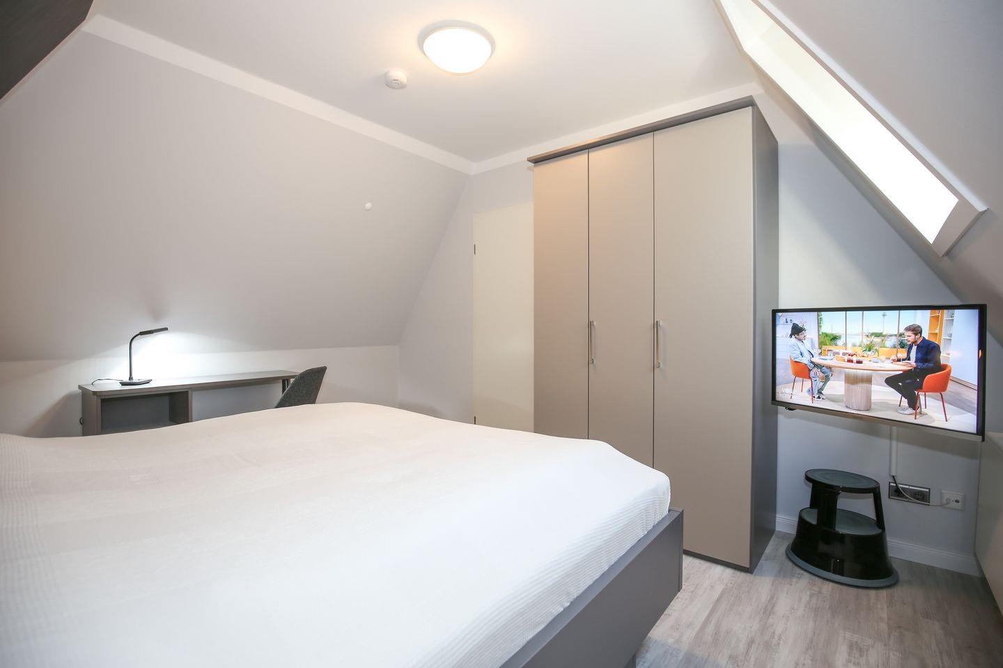 Im Schlafzimmer der Ferienwohnung stehen ein gemütliches Doppelbett, ein Kleiderschrank, ein Schreibtisch sowie ein zweiter TV für dich bereit. Die 3. Person kann bequem auf dem Schlafsofa (140 x 200 cm) übernachten. Dieses findest du auf dem Vorflur des 1. Schlafzimmers. Zur Verdunklung wurden an den Fenstern Rollos angebracht.