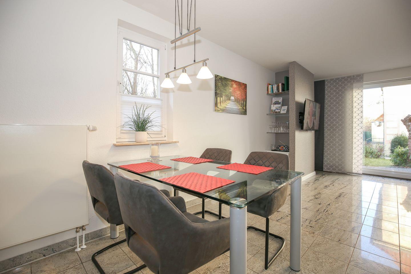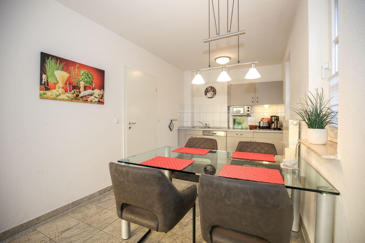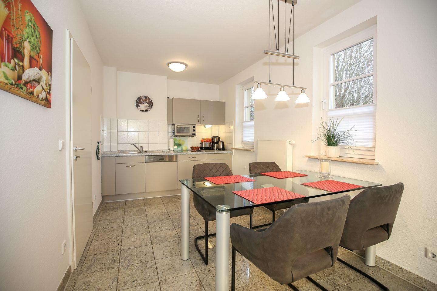 An den Wohnraum angrenzend findest du außerdem die funktional eingerichtete Küchenzeile. Diese verfügt über ein 4-Platten-Cerankochfeld, einen Geschirrspüler, eine Mikrowelle, einen Kühlschrank mit Gefrierfach sowie einen Wasserkocher, einen Toaster und eine Kaffeemaschine. Am Esstisch haben bis zu 4 Personen Platz.