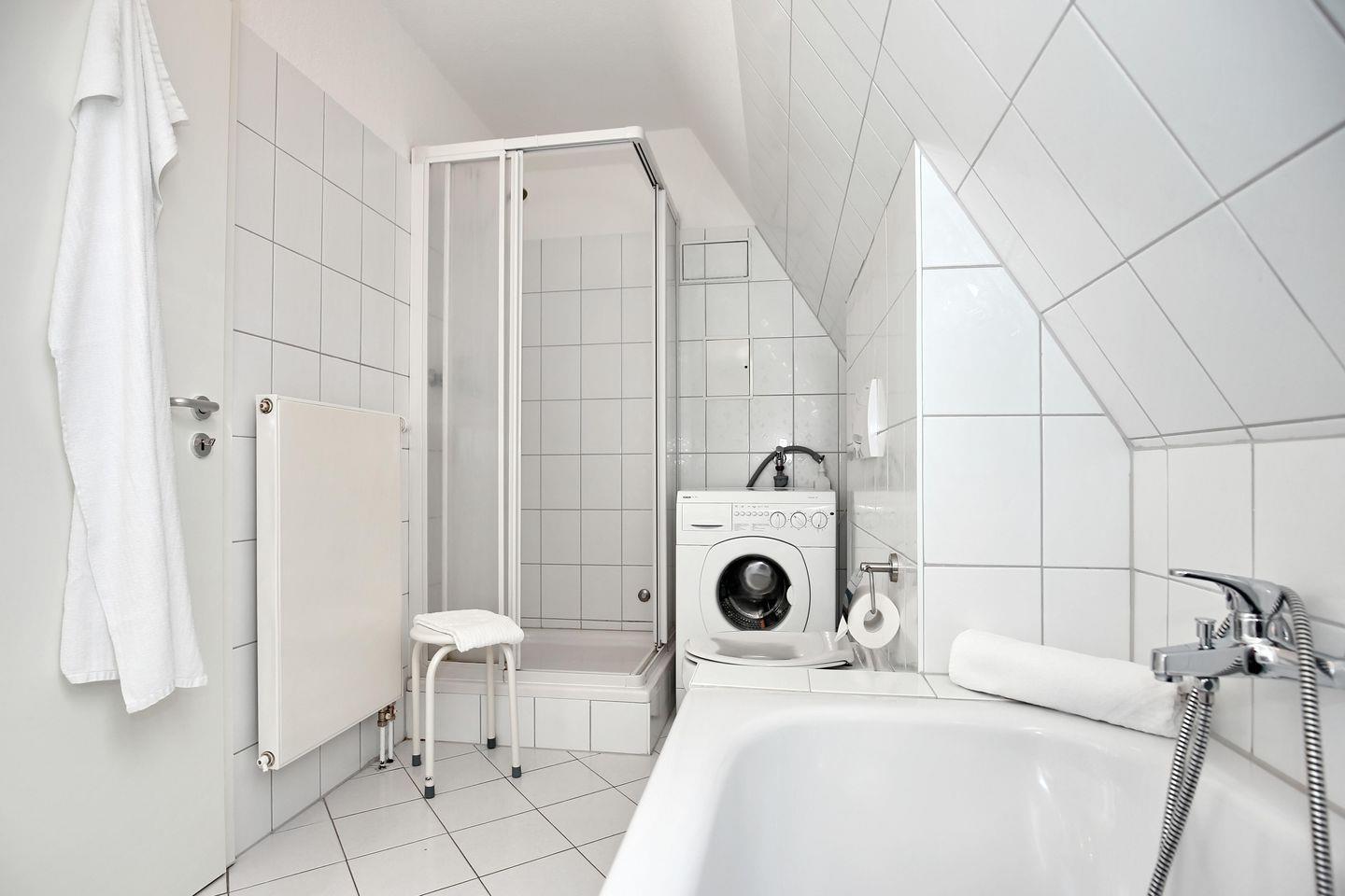 Im Badezimmer gibt es eine Waschmaschine, ein WC, eine Dusche sowie eine Badewanne. Außerdem gehört ein Föhn zur Ausstattung. Als Bodenbelag wurde in der gesamten Wohnung ein hochwertiger Fliesenbelag gewählt. Nur in den Schlafzimmern sorgt der Teppichboden für Behaglichkeit.