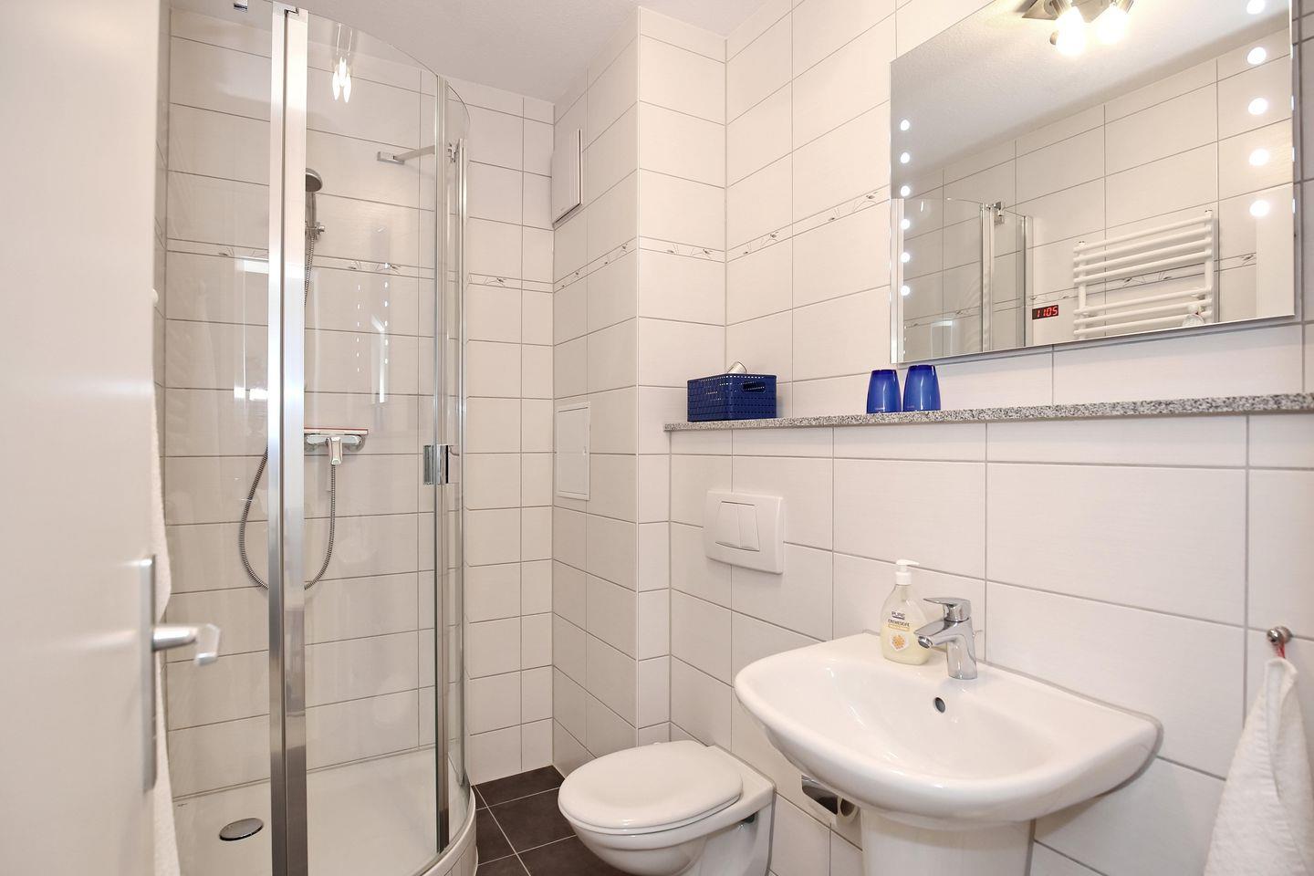 Das Badezimmer ist mit einer Dusche/WC versehen und gefliest. Der Fußboden in der Ferienwohnung ist mit Laminat ausgelegt.