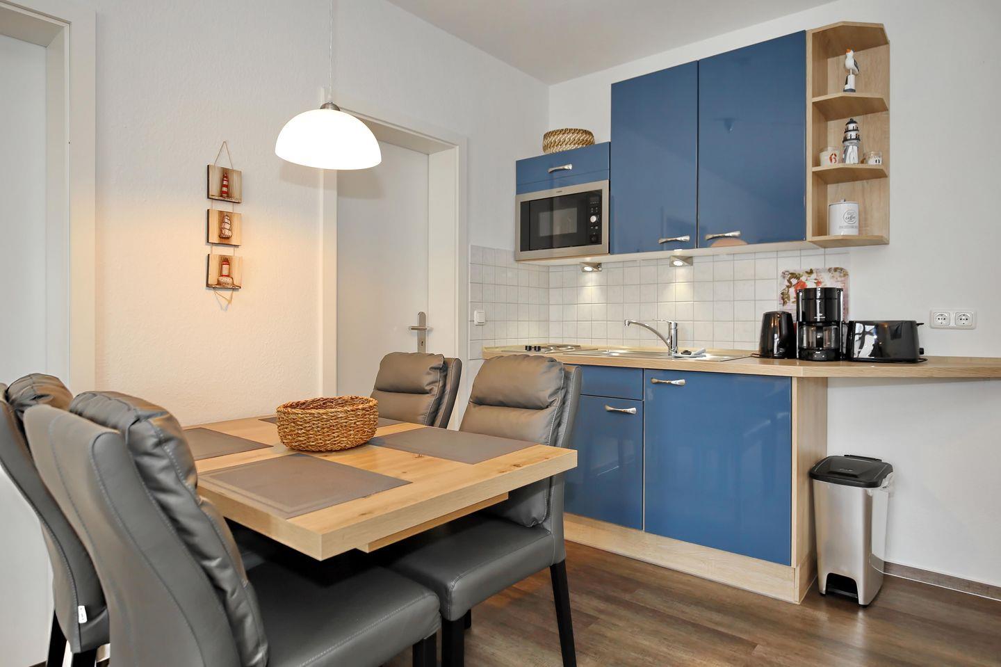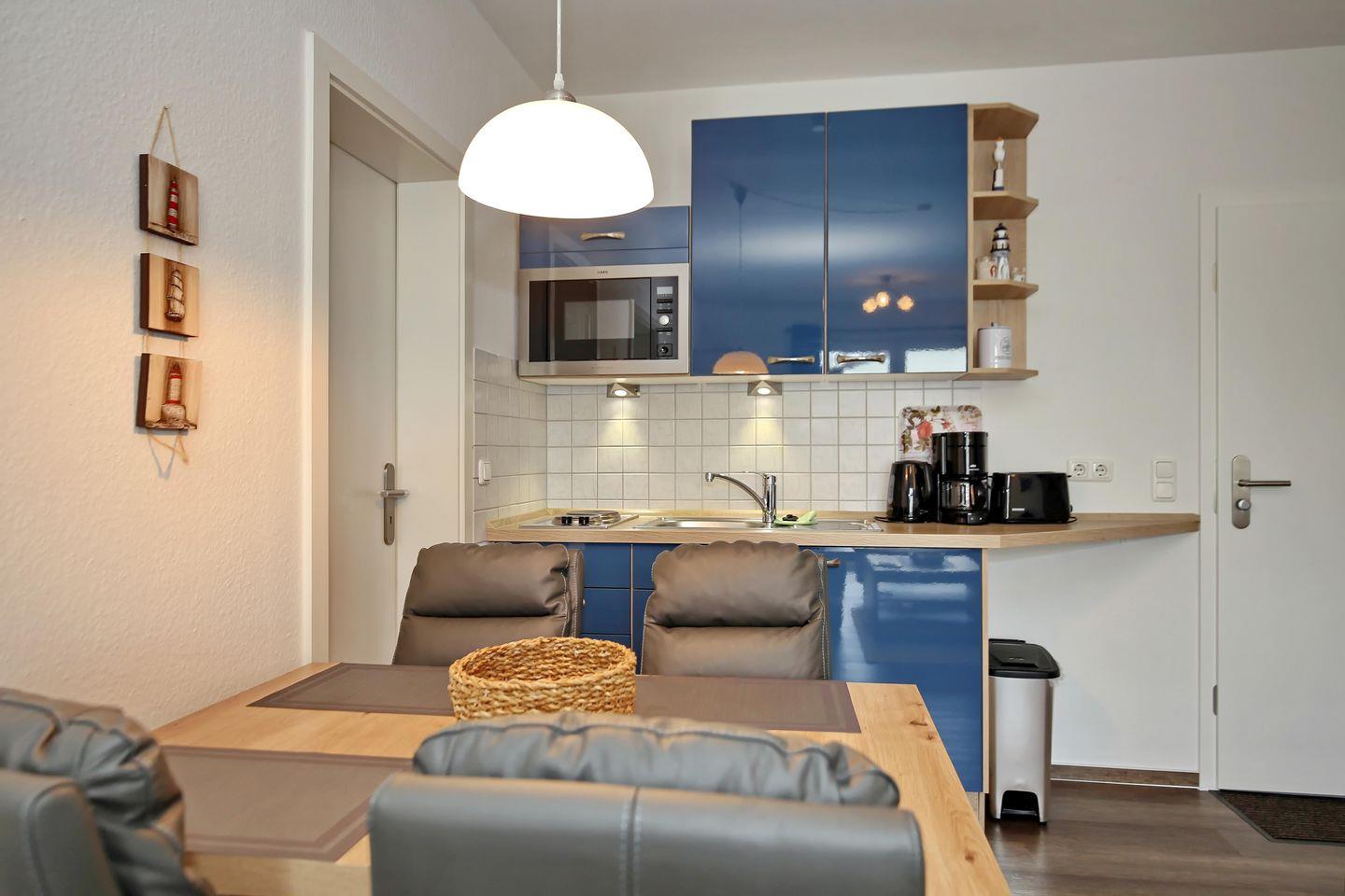Die Küchenzeile ist mit allem ausgestattet, was man so braucht – Kühlschrank, 2 Kochplatten, Mikrowelle, Kaffeemaschine, Toaster, Wasserkocher sind natürlich vorhanden.