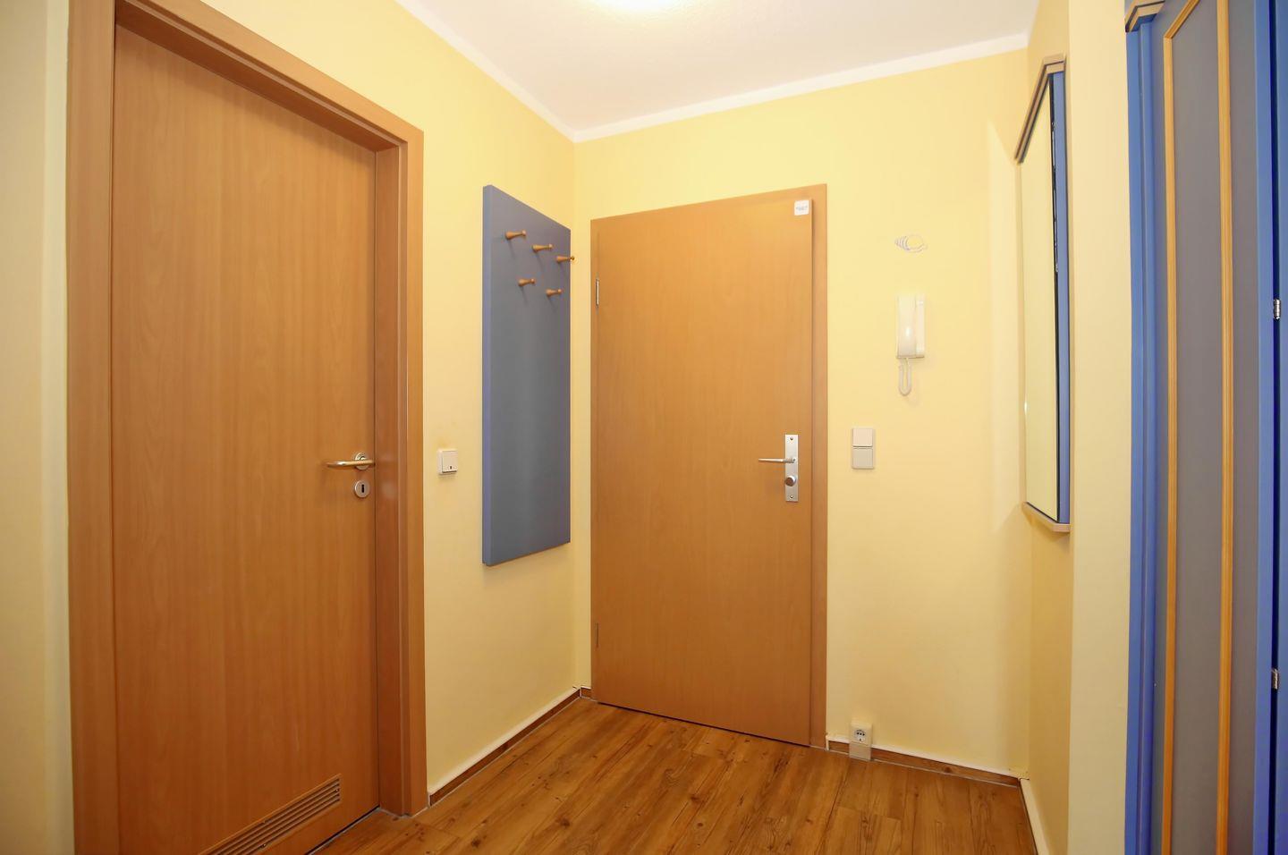 Das Bad mit WC und Dusche verfügt über einen Waschtisch mit beleuchtetem Spiegel sowie einen Handtuchtrockner und ein kleines Regal. Design-Belag ist in der Wohnung verlegt. Das Duschbad und der Bereich vor der Küchenzeile sind gefliest. Rauchen ist in dieser Ferienwohnung nicht gestattet. Haustiere sind nicht erlaubt.