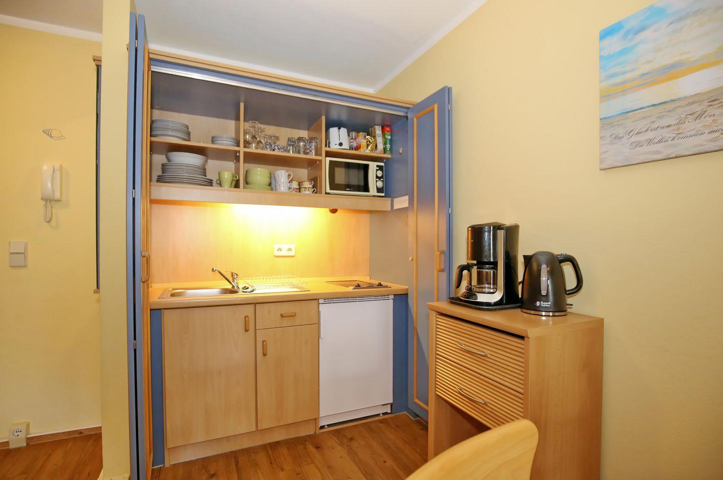 In der Pantry-Küche der Ferienwohnung stehen ein 2-Platten-Cerankochfeld, ein Kühlschrank mit Gefrierfach, eine Mikrowelle sowie eine Kaffeemaschine und ein Toaster zur Verfügung.