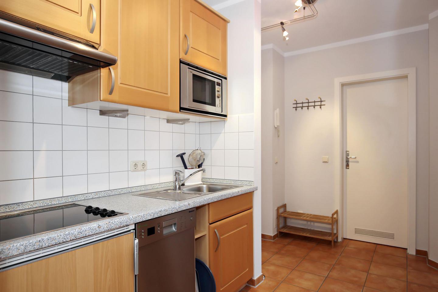 Zur Kücheneinrichtung gehören ein Kühlschrank mit Gefrierfach, ein 4-Platten-Cerankochfeld, ein Geschirrspüler und eine Mikrowelle. Die Ausstattung wird durch einen Wasserkocher, einen Toaster und eine Kaffeemaschine komplett.