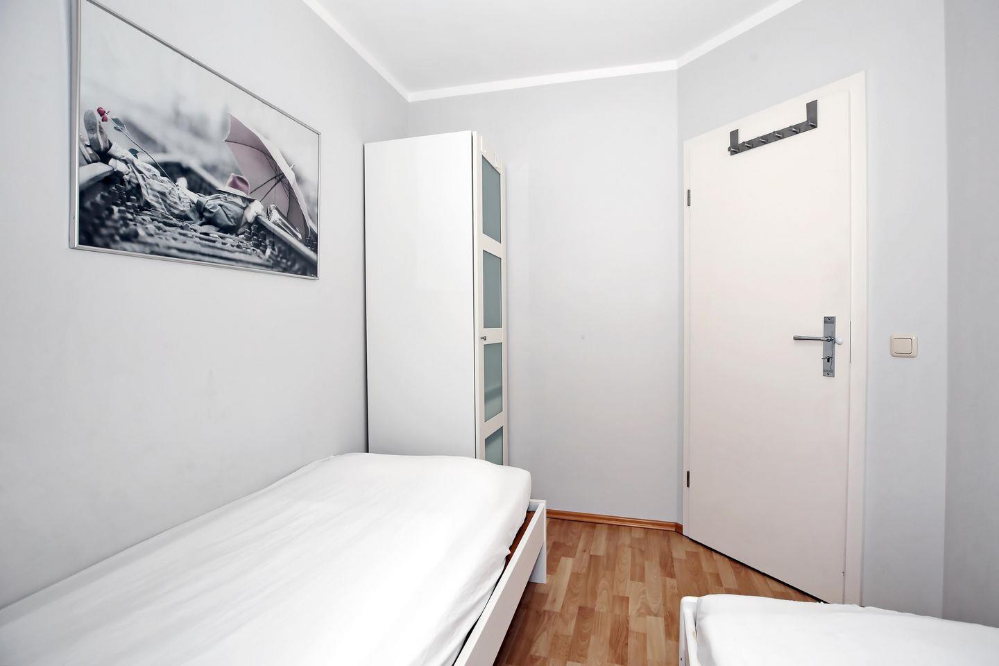 Im Hauptschlafzimmer der Ferienwohnung erwarten dich ein Doppelbett (2 x 90 x 200 cm) und ein Kleiderschrank, der dir ausreichend Stauraum für deine Urlaubskleidung bietet. Im zweiten Schlafzimmer erwarten dich 2 bequeme Einzelbetten (1 x 90 x 200 cm und 1 x 80 x 200 cm) und ein weiterer Kleiderschrank. Vorhänge dienen dir als Sichtschutz oder als Verdunkelung.