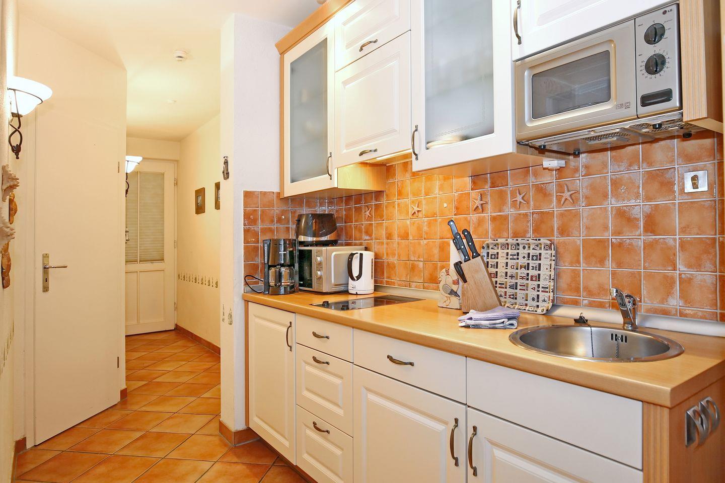 Die im Wohnzimmer integrierte Küchenzeile beinhaltet 2-Cerankochfelder, einen Geschirrspüler und eine Mikrowelle. Ein Kühlschrank mit Gefrierfach, eine Kaffeemaschine, ein Wasserkocher und ein Toaster komplettieren die Ausstattung der Küche.