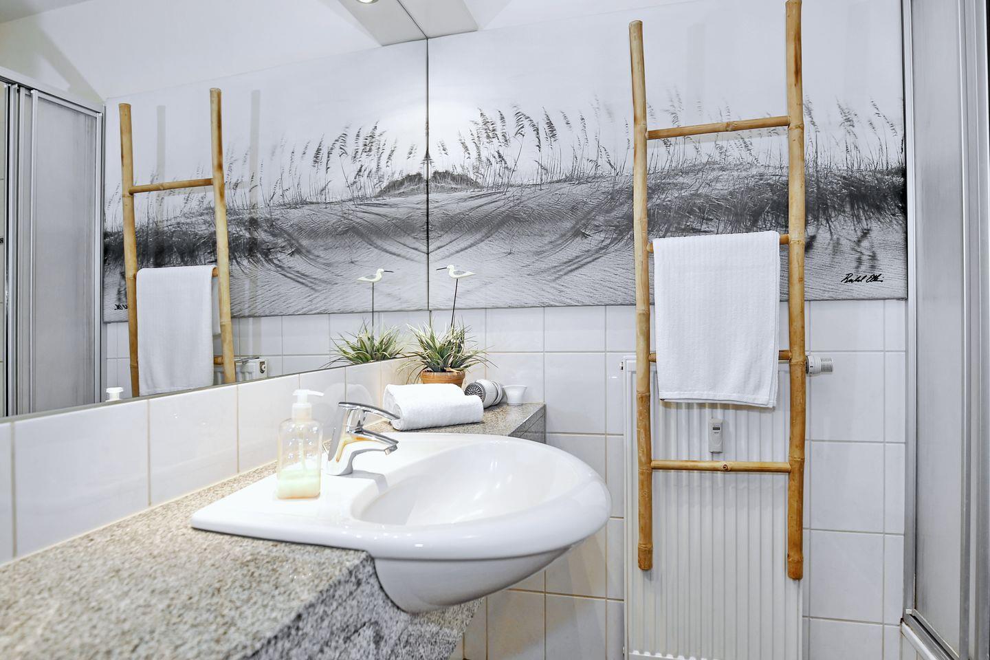 Zur Ausstattung gehören weiterhin zwei Fernseher, ein DVD-Player und ein kostenfreier WLAN-Zugang (ohne Gewähr). Die Ferienwohnung verfügt selbstverständlich auch über ein gefliestes Duschbad/WC mit Föhn und Kosmetikspiegel.