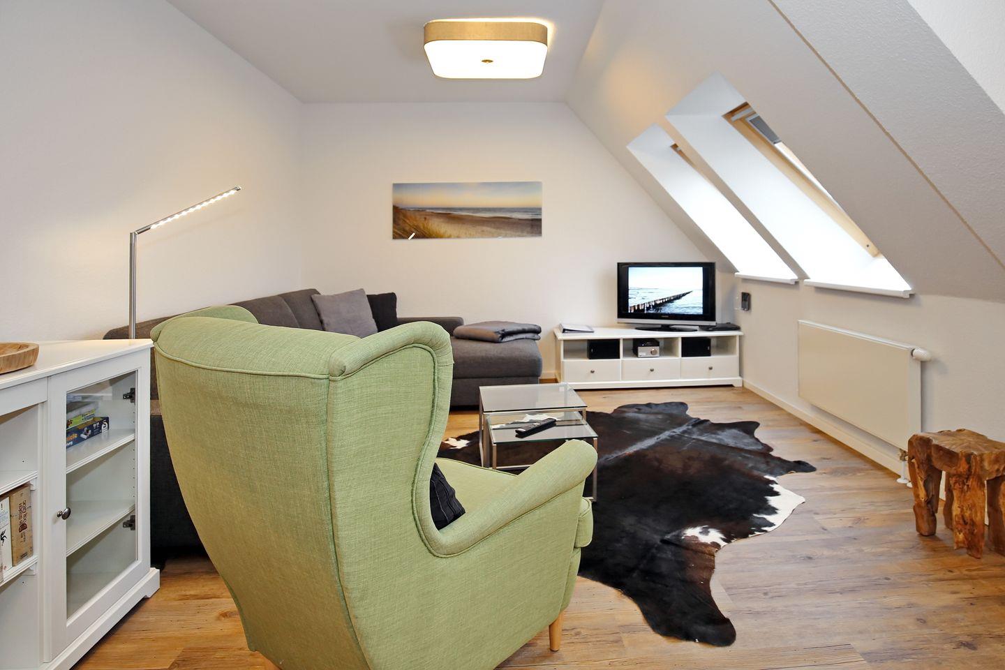 Der Wohnbereich der Ferienwohnung empfängt dich mit einer gemütlichen Couch mit Sessel, einem Flatscreen-TV, einer Stereoanlage sowie einem CD-Player und einem DVD-Player. Den WLAN-Anschluss kannst du kostenlos nutzen. Der angrenzende Essbereich bietet dir mit einem großen Tisch viel Platz für deine gemeinsamen Mahlzeiten. Für die kleinen Gäste sind ein Kinderstuhl und ein separater Kinderhochstuhl vorhanden.