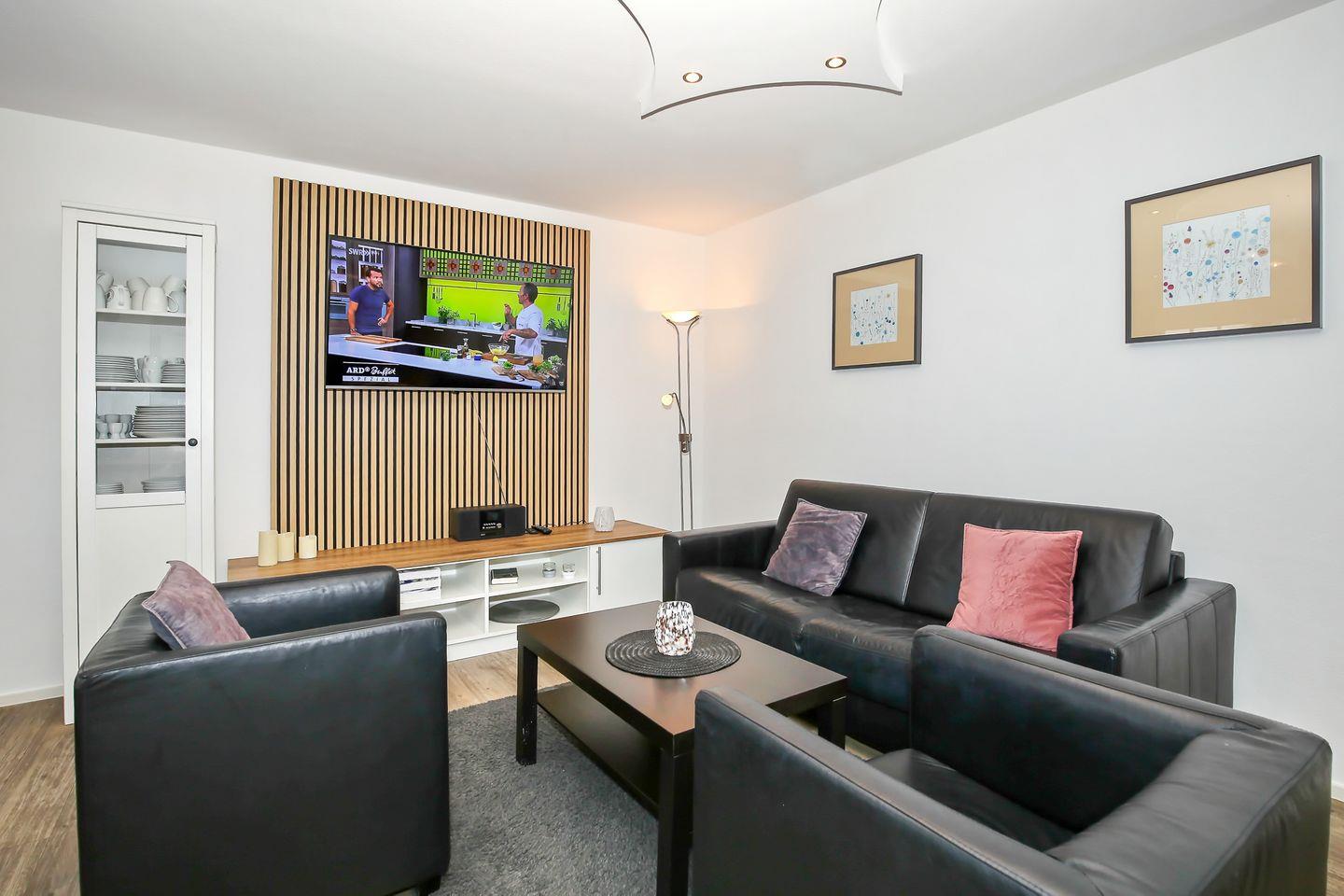 Der moderne Wohnraum der Ferienwohnung lädt mit einem gemütlichen Schlafsofa (140 cm x 200 cm), zwei Sesseln, einem modernen Flachbild-TV und einem Blu-Ray-Player zum Verweilen ein. Von hier aus gelangst du auf einen der Balkone. Am Esstisch hast du genügend Platz für gemeinsame Mahlzeiten.