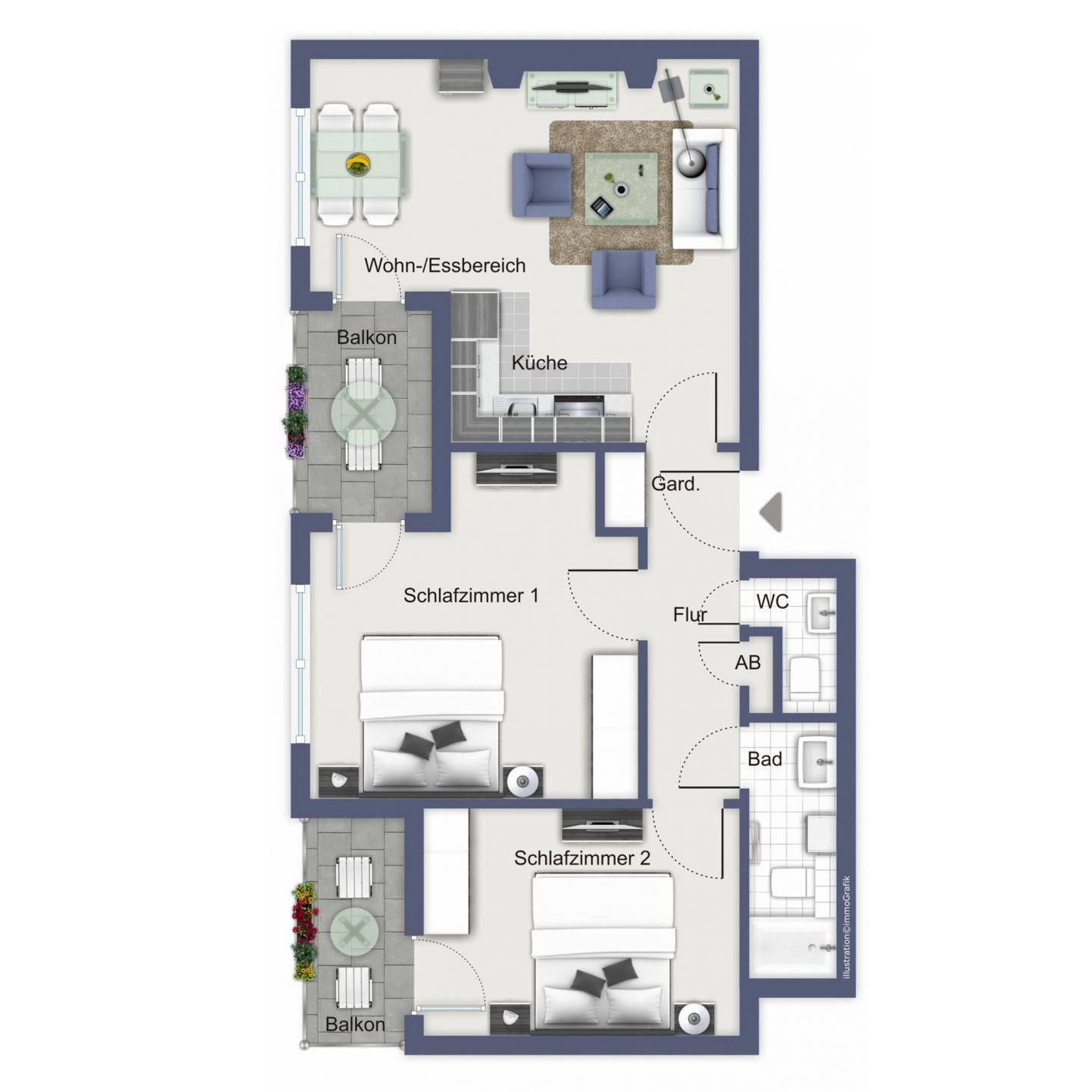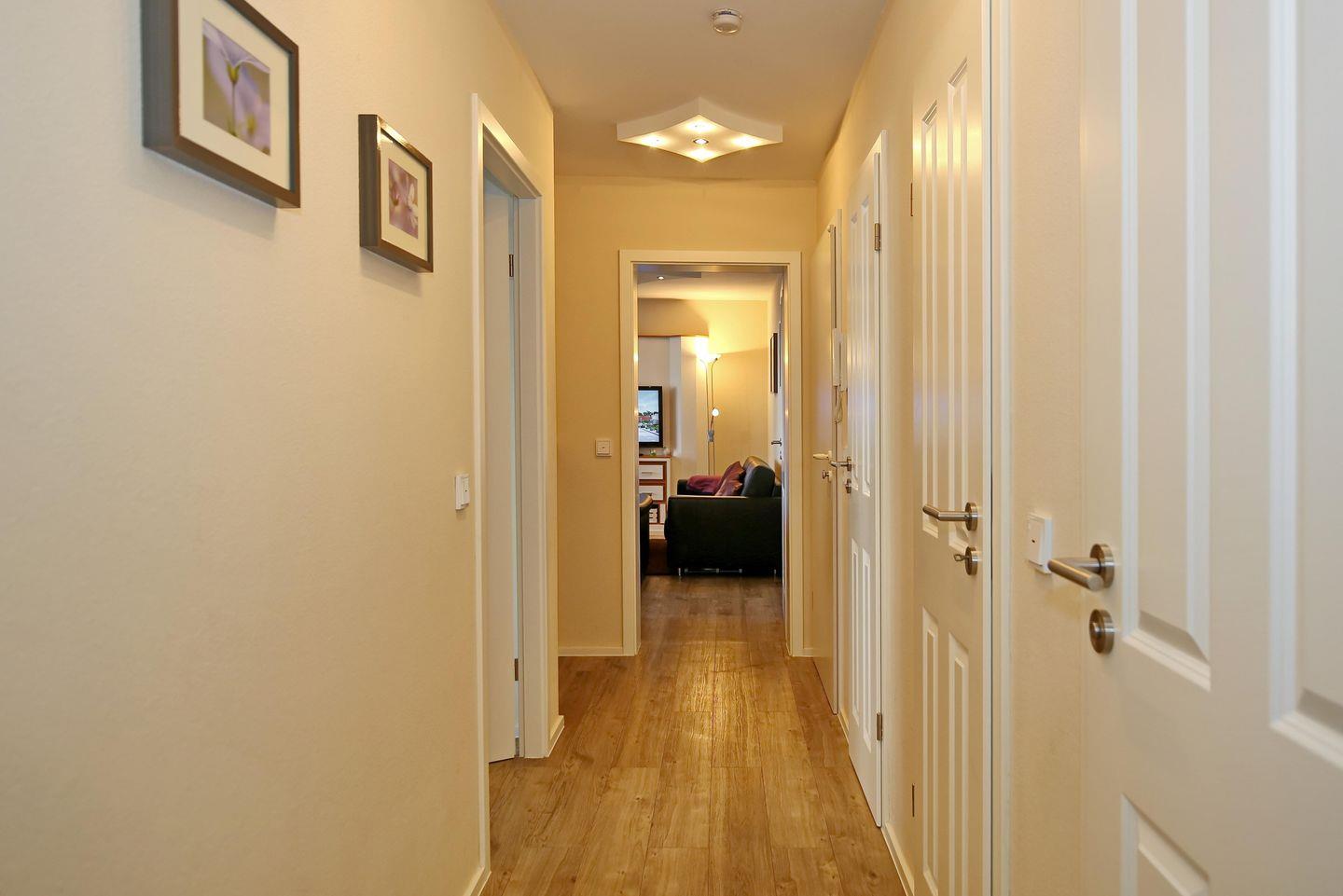 In den Schlafzimmern der Ferienwohnung lädt je ein gemütliches Boxspringbett (180 cm x 200 cm) zum erholsamen Schlaf ein. Die Schwebetürenschränke und Flachbild-Fernseher vervollständigen die ansprechende Ausstattung. Zur Verdunklung dienen dir in der gesamten Wohnung Vorhänge und Plissees. Von dem nordöstlich gelegenen Schlafzimmer erreichst du den kleinen Balkon mit Teilseeblick.