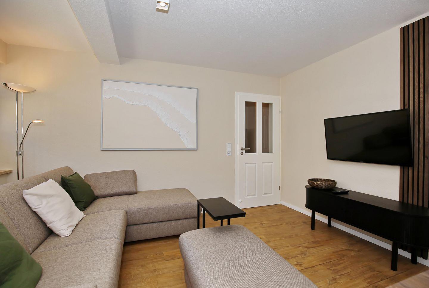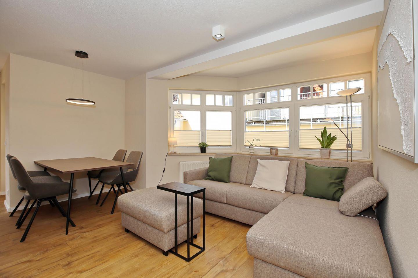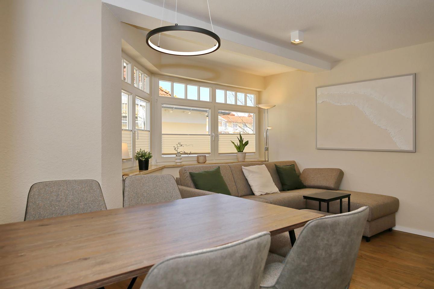 Der modern eingerichtete Wohnraum der Ferienwohnung lädt mit einer gemütlichen Schlafcouch (120 cm x 200 cm), einem modernen Flachbild-TV und einer Bluetooth-Musikanlage zum Verweilen ein. Von hier aus gelangst du auf die zwei Südbalkone der Wohnung. Am Esstisch hast du genügend Platz für gemeinsame Mahlzeiten.