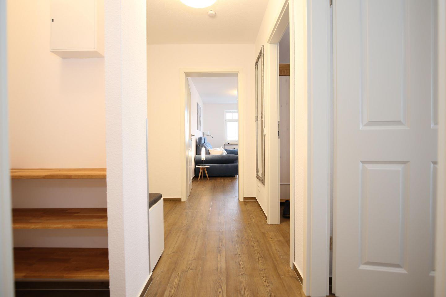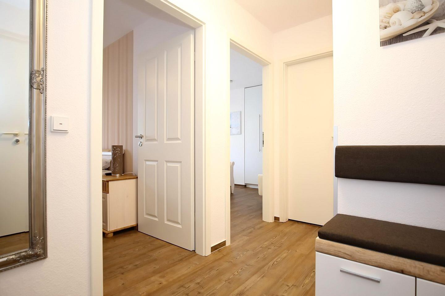 Deine moderne Ferienwohnung befindet sich im 2. Obergeschoss. Mit einer Größe von 57 m² bietet die Wohnung mit einem Wohn- und Essbereich, zwei geräumigen Schlafzimmern, einer Küchenzeile und einem Duschbad viel Platz für einen erholsamen Urlaub am Ostseestrand. Die Entfernung zum Strand beträgt etwa 100 Meter.