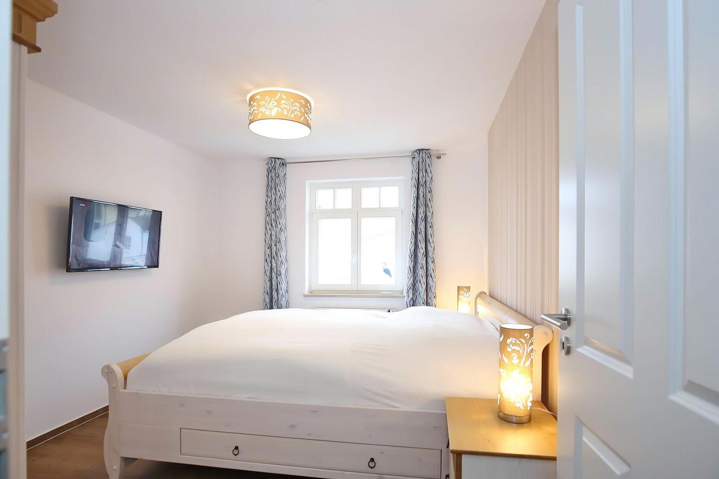 In den Schlafzimmern der Ferienwohnung lädt je ein gemütliches Doppelbett (2 x 90 cm x 200 cm) zum ausgedehnten Schlaf ein. Für deine Urlaubsbekleidung findest du in den Kleiderschränken und Nachtkommoden genügend Stauraum. In einem Schlafzimmer befindet sich ein zweiter TV. Vom anderen Schlafzimmer aus gelangst du auf den Ostbalkon. Die Vorhänge an den Fenstern dienen dir zur Verdunklung.