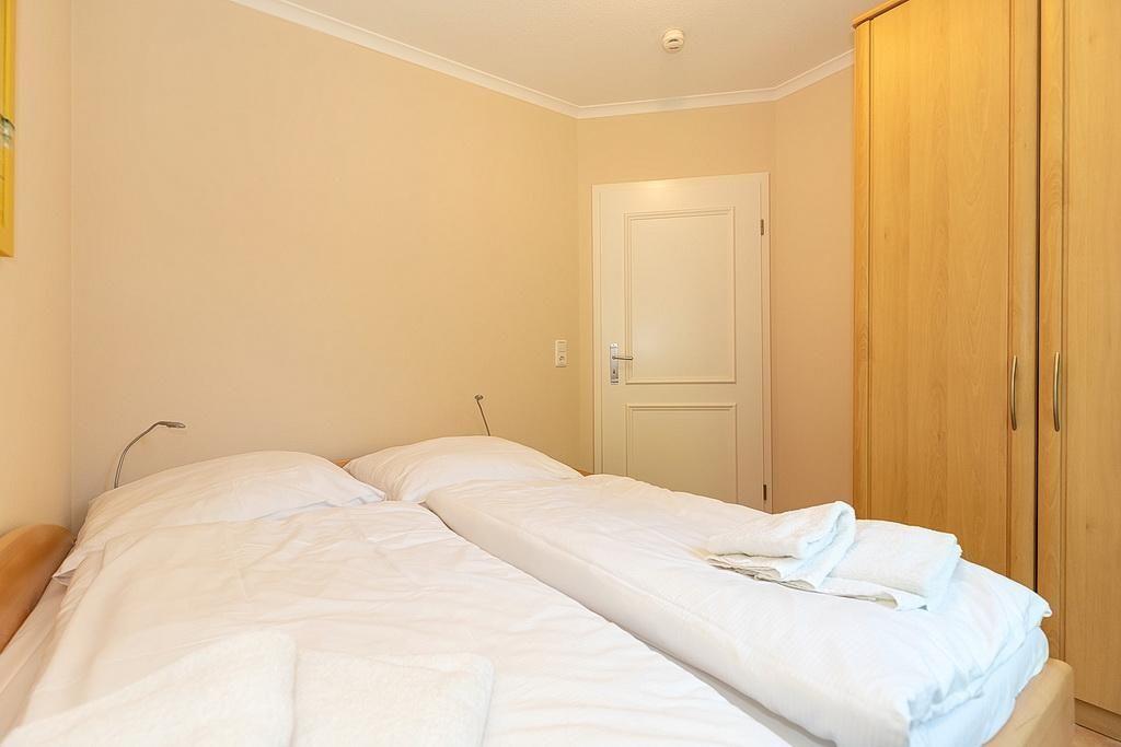 Die geflieste Ferienwohnung besteht aus zwei Schlafzimmern mit Doppelbetten, einem Wohnbereich mit einem Balkon nach Norden und aus einem Bad mit Dusche.