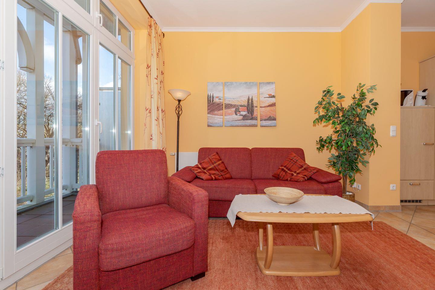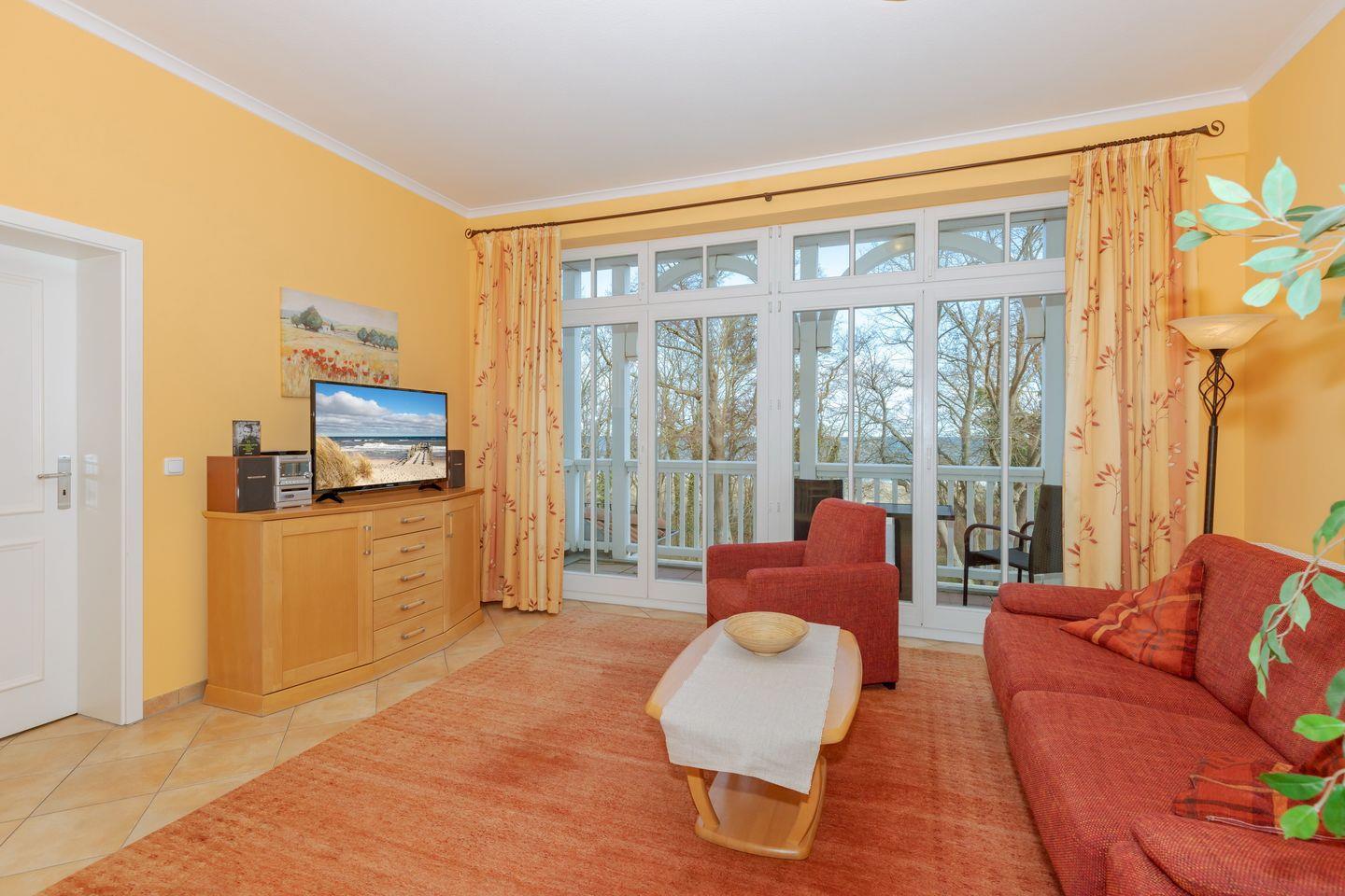 Das mediterran eingerichtete Apartment verfügt über ein Schlafzimmer mit Doppelbett (2 x 90 x 2,00 ), einen Wohnbereich mit Doppelschlafcouch, ein Bad mit Badewanne nebst Duschvorhang. Der Balkon verfügt in den Wintermonaten über Meerblick, wenn die Bäume ihre Blätter verloren haben und die Sicht auf die Ostsee freigeben. .